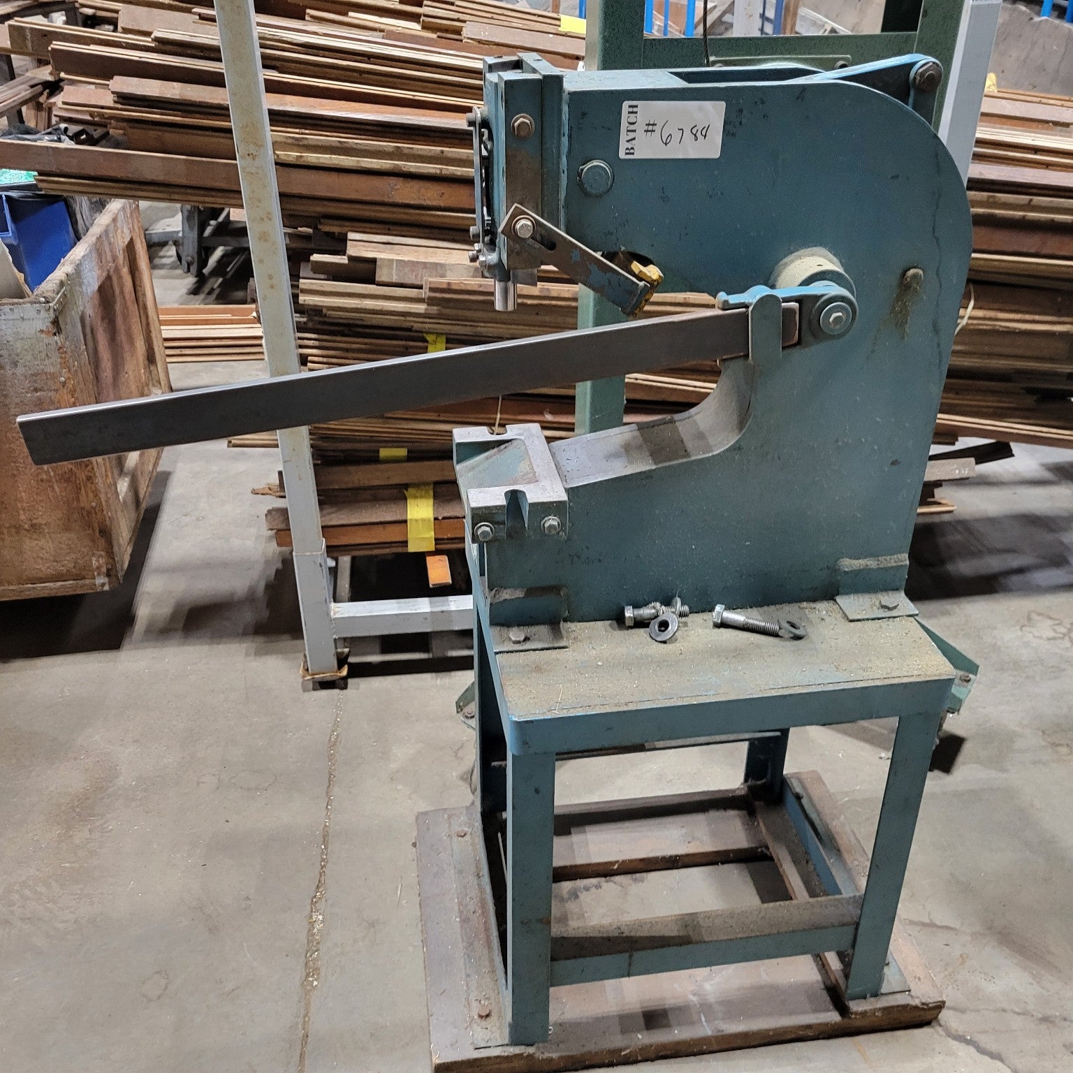 Description : **Description:** A manually operated punch press designed for metalworking applications, ideal for punching clean holes in various sheet materials. The model features a sturdy cast iron frame, a long lever arm for easy operation, and is mounted on a metal base for stability. This listing does not include dies. **Era:** Mid-20th Century **Style:** Industrial Metalworking Equipment **Technique:** Hand-punching through mechanical leverage **Tools Used:** Cast components, lever mechanism, adjustable punch. **History:** Roper Whitney has been a recognized name in the metalworking industry, producing reliable and durable tools since the early 1900s. The Model 34 is known for its versatility and durability, making it a staple in workshops and industrial settings. **Manufacturer / Maker:** Roper Whitney, Inc. **Measurements:** Approximate height: 36", base: 24" x 18" (verify dimensions if needed). **Suggested Weight:** ~100 lbs