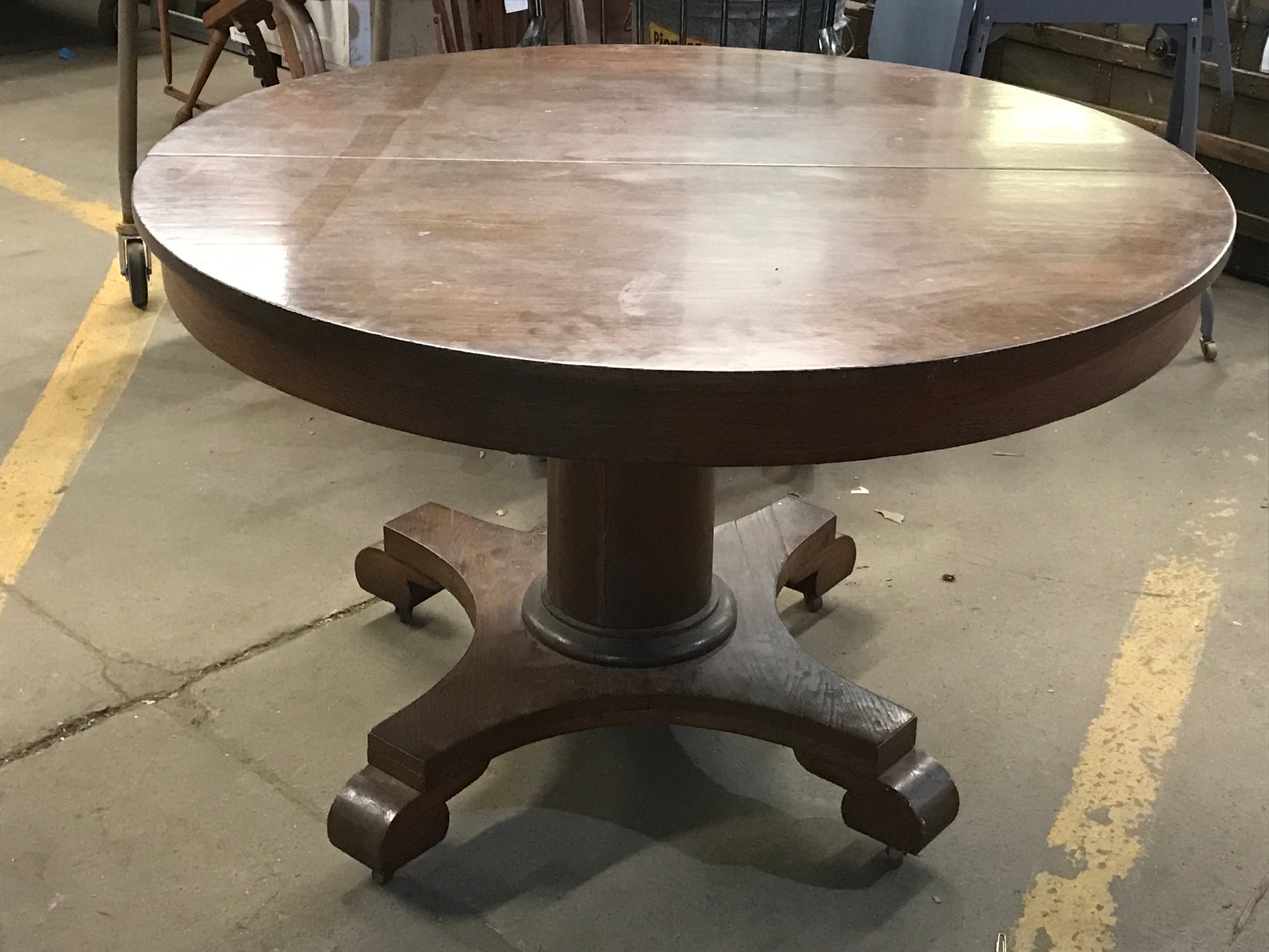 Description : round top hardwood table on wheels. No leaf. 45" diameter 29" height