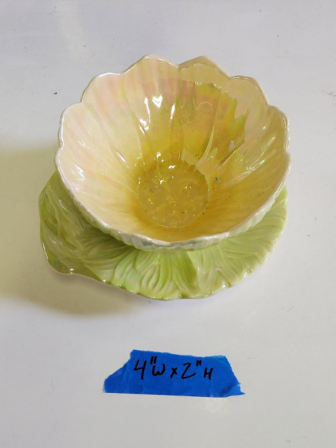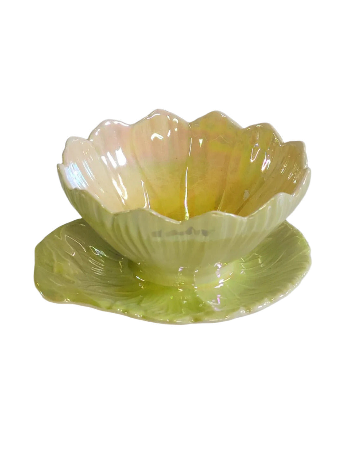 This charming lusterware lotus bowl with its matching underplate is a quintessential piece of Royal Winton Grimwades pottery from England. The flower-shaped bowl glows with soft yellow and pink iridescence, while the accompanying leaf plate provides an organic, textured base in light green. Both pieces showcase Royal Winton’s signature delicate finish and floral inspiration, reflecting the brand’s Art Deco and mid-century tableware legacy. Light crazing is visible, consistent with age, but overall the set retains its beauty and function for display or gentle use. A fine addition for collectors of vintage English ceramics or lusterware fans.