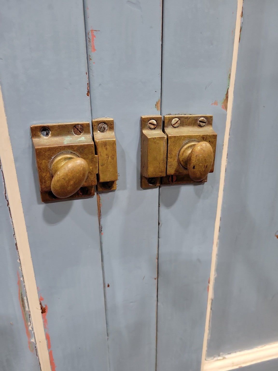 Description : This vintage freestanding cabinet features paneled construction with double doors, finished in a charming distressed sky-blue paint with subtle red underlayers. The interior reveals vertical plank paneling in a natural wood tone, offering a warm contrast. Though the doors are detached, they retain their original brass surface latches and hinges, ready to be reattached or repurposed. Ideal for use as a base cabinet, console, or custom vanity.