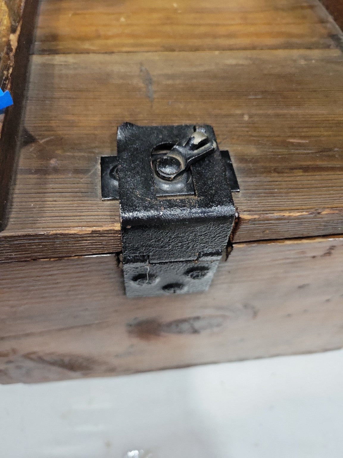 Hand-assembled using reclaimed solid wood boards with rough-cut edges, iron corner hinges, and latched closure
