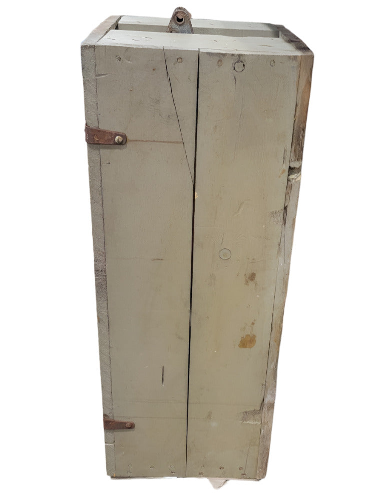 This rugged and functional wood tool chest features a timeworn paint finish and a hinged lid with sturdy iron hardware. Built from solid plank boards with visible nailheads and bracket reinforcements, the chest opens to reveal a simple compartment suited for hand tools or supplies. The piece shows heavy patina, chipped paint, and age-appropriate wear, enhancing its character and authenticity. Originally used in a workshop or utility space, it’s ideal for storage, decor, or repurposing in industrial, farmhouse, or garage settings.