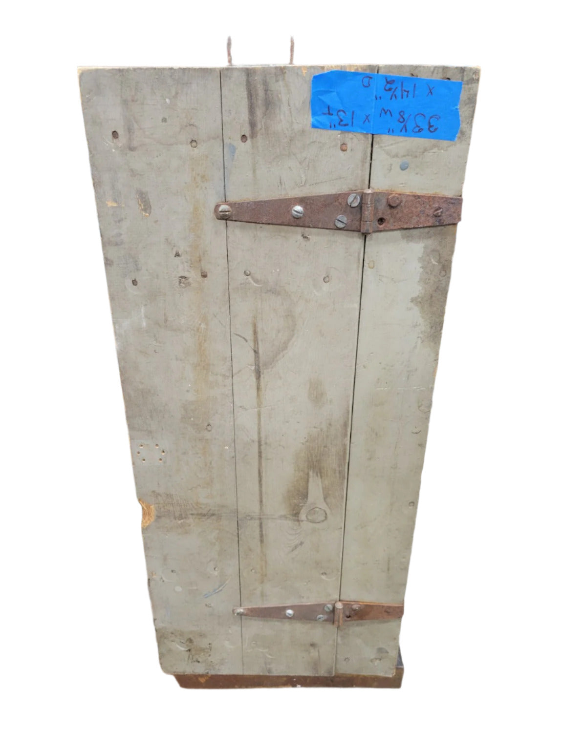 Hand-assembled with plank joinery, painted and aged finish, riveted strap hinges