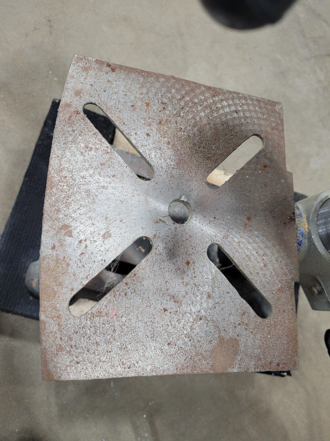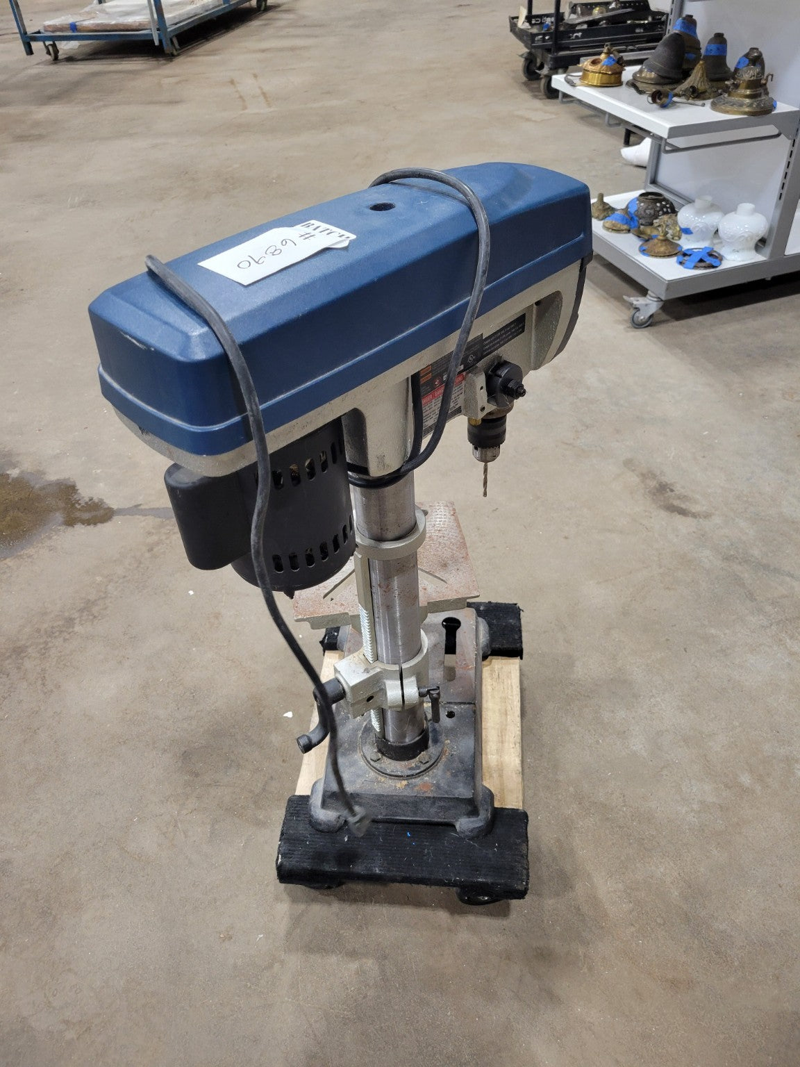 This Ryobi 10" bench-top drill press is a compact, reliable machine ideal for woodworking and light metalwork. It features a variable speed motor, laser alignment guide, integrated work light, and adjustable depth stop. Mounted to a wood dolly base for mobility, it shows signs of surface rust on the table but remains structurally intact. Its cast iron base and steel column ensure stability, making it a great fit for home shops or small fabrication projects.