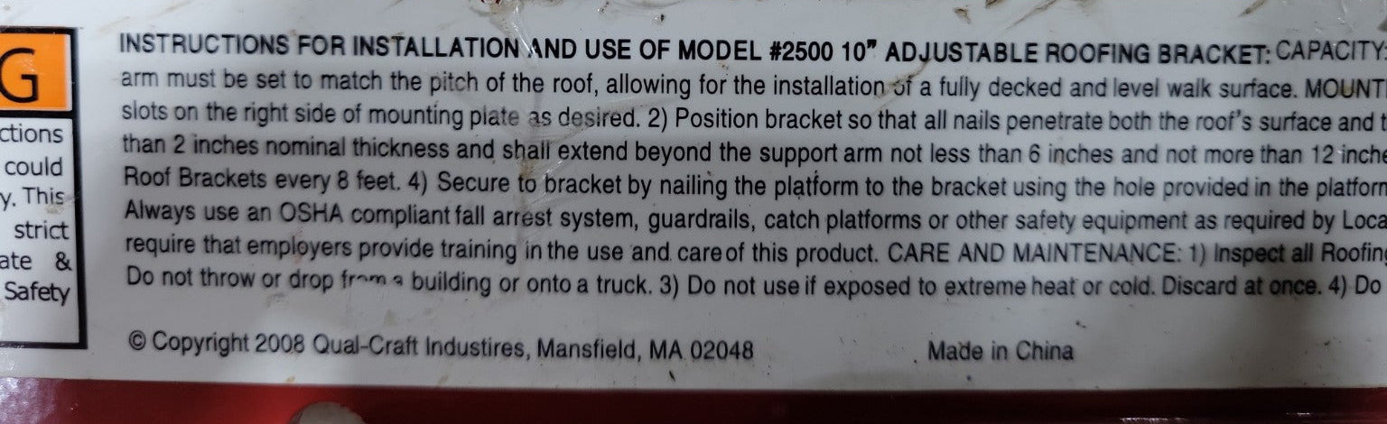 This set includes ten Qual-Craft #2500 adjustable roofing brackets, each designed to support 10" planks for temporary scaffolding during roofing projects. Constructed from heavy-duty powder-coated steel and painted bright red for visibility, these brackets are adjustable to match various roof pitches. They feature teardrop nail slots, support arms, and welded reinforcement for added safety. Sold AS-IS, the brackets show signs of wear such as scratches, chipped paint, and light surface rust, but remain structurally solid for reuse or repurpose.