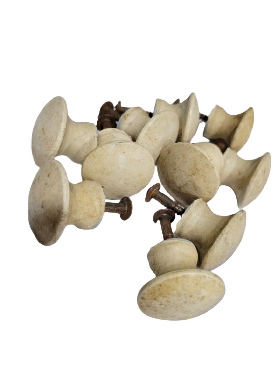 This set of ten matching vintage wooden drawer knobs features a flared, classic shape with a warm cream-colored painted finish. Each knob measures approximately 1¼" in diameter and comes with its original aged hardware, showcasing signs of rust and patina consistent with time. Ideal for restoring older cabinetry or creating a cohesive vintage aesthetic on modern furniture, this set offers both function and authentic charm.