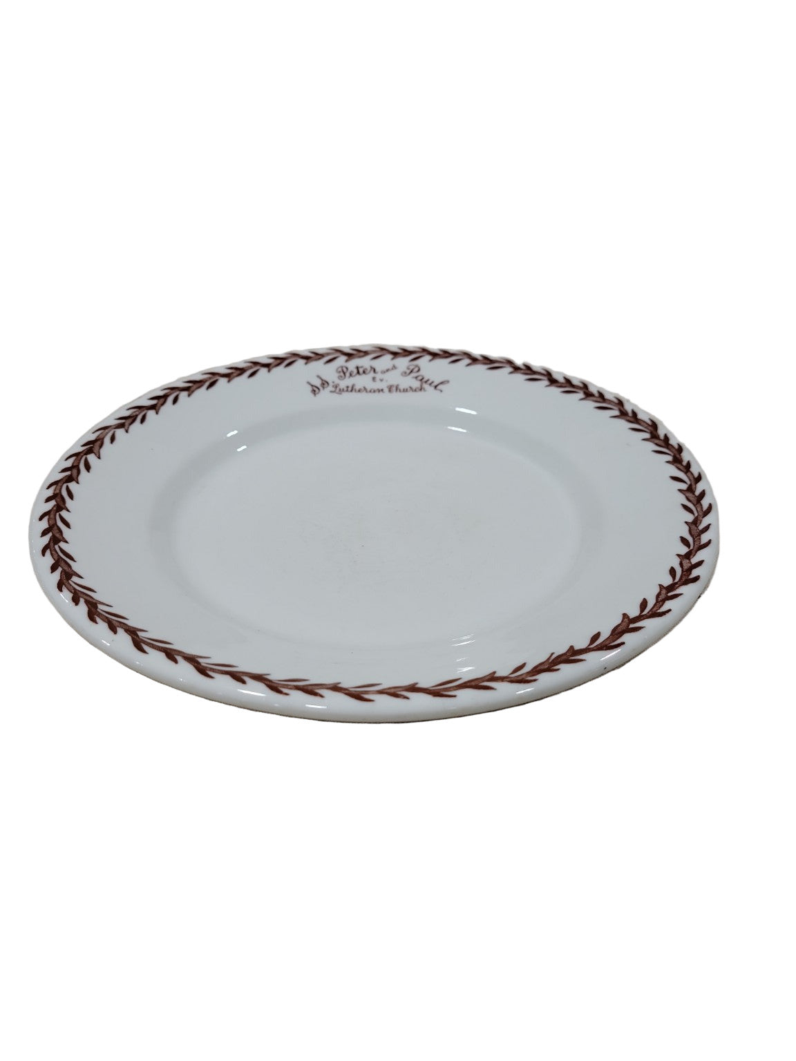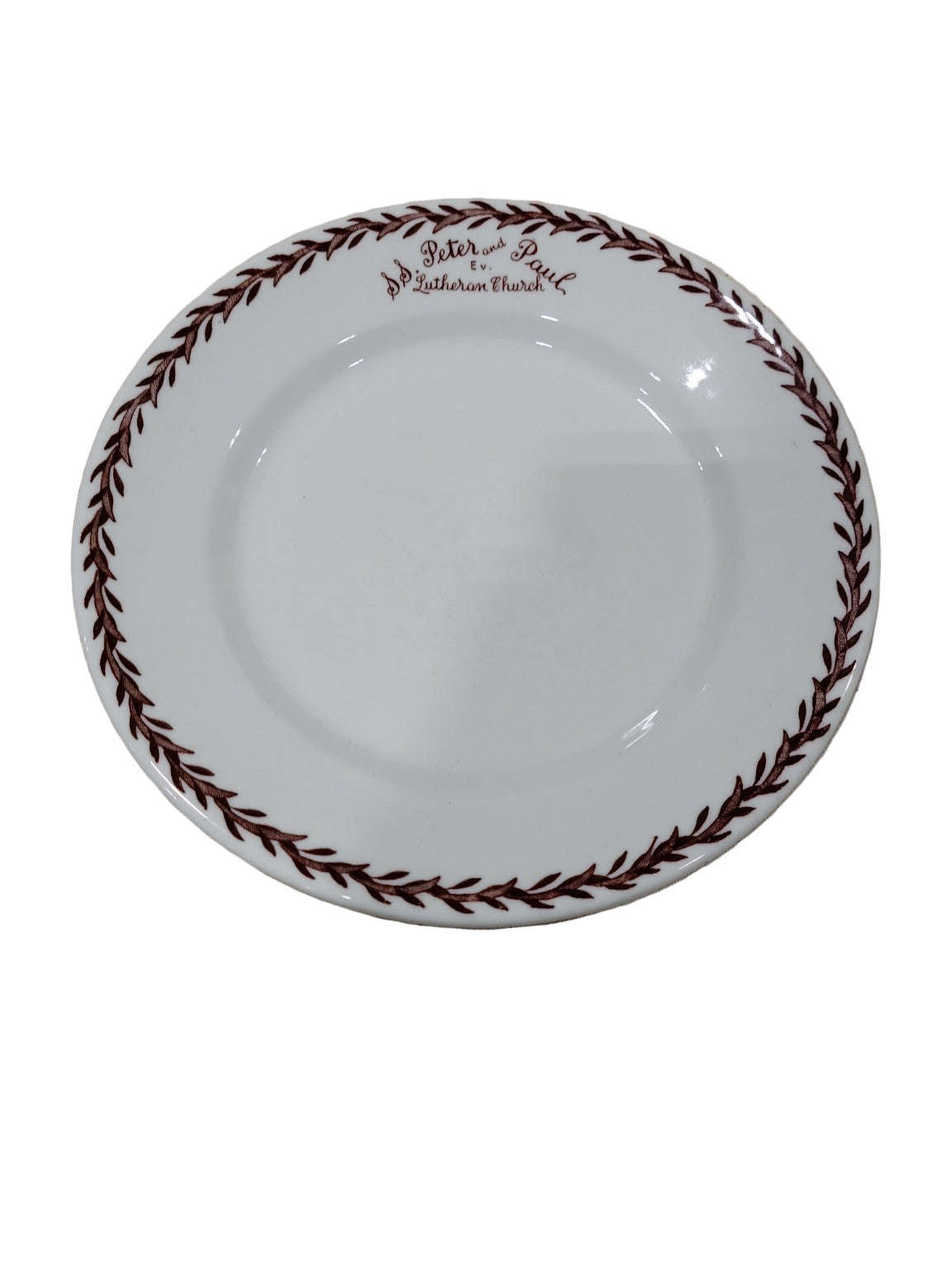 Description : This set of 11 vitrified dinner plates was produced by Walker China of Bedford, Ohio, featuring the "Garland" pattern with a brown laurel wreath border and a scripted inscription reading “SS. Peter and Paul EV. Lutheran Church.” These 9½" diameter plates are heavy, durable, and well-suited for institutional use, having been originally made for church events or commemorative serviceware. The clean, classic design and robust construction make these plates both collectible and fully functional for everyday use.