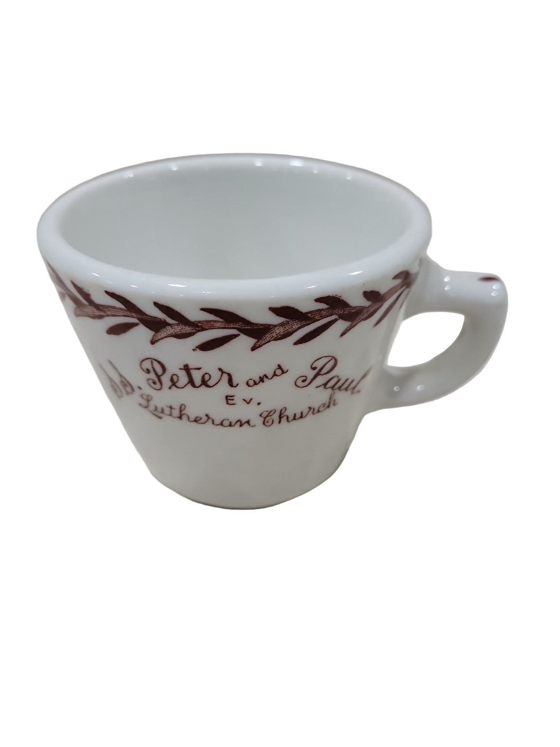 Description : This is a full set of 19 vitrified diner-style porcelain cups, custom made by Walker China of Bedford, Ohio. Each cup is adorned with a brown transferware design, featuring a laurel band and the inscription “SS. Peter and Paul EV. Lutheran Church” in classic script. These heavy-duty cups were likely produced mid-century for church service or commemorative events. With their thick-walled design and glossy glaze, they reflect the era’s utilitarian yet elegant American commercial china manufacturing. This set is not only collectible but highly functional for hot beverages.
