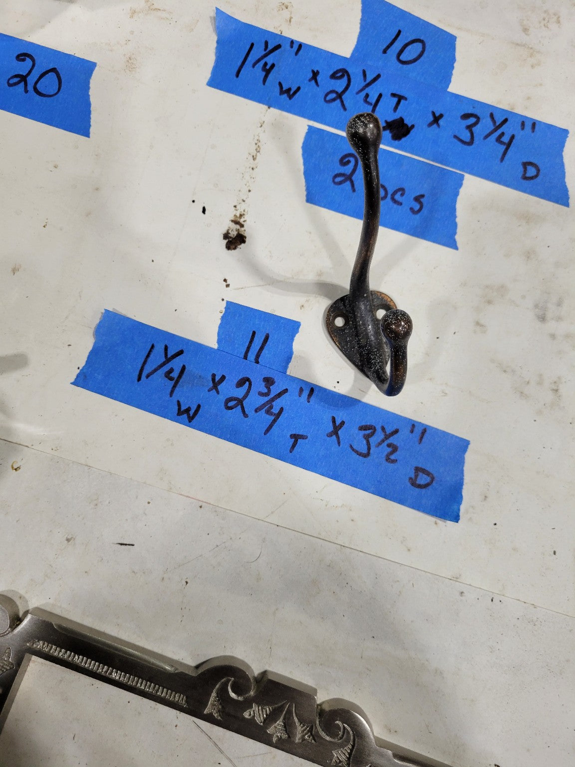 This matching pair of cast iron wall hooks features a classic ball-end double-hook design with a lightly worn, dark bronze finish. Measuring 1 ¼" W x 2 ¾" T x 3 ½" D, each hook mounts via two holes in the baseplate and offers both upper and lower hanging arms for coats, hats, or bags. Their hand-worn look and durable heft make them ideal for rustic interiors, workshops, or vintage-inspired entryways.