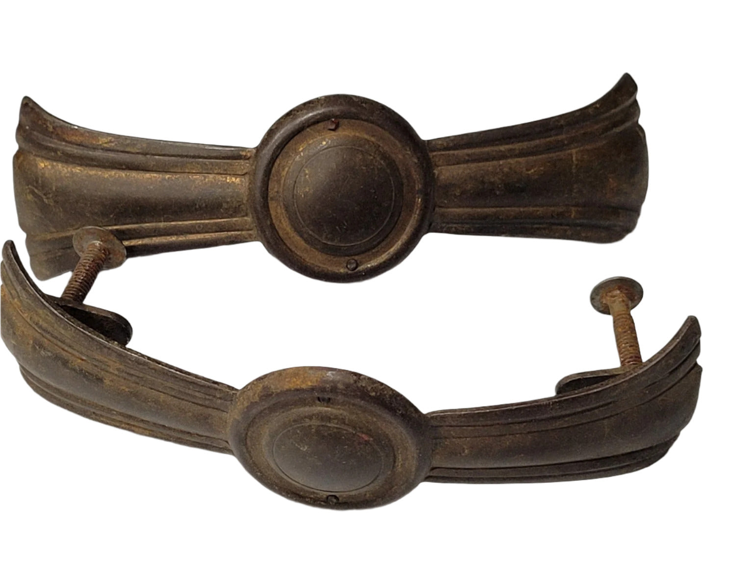 This set of two brass drawer pulls embodies the streamlined aesthetics of early Mid-Century design with clear Art Deco influence. Each pull features bold horizontal lines that flow outward from a central raised medallion, giving a sense of movement and symmetry. Ideal for restoring waterfall dressers, vintage vanities, or built-ins, they measure 4 ⅝" W x 1 5/16" T. Naturally aged with a soft brass patina and complete with original screws.