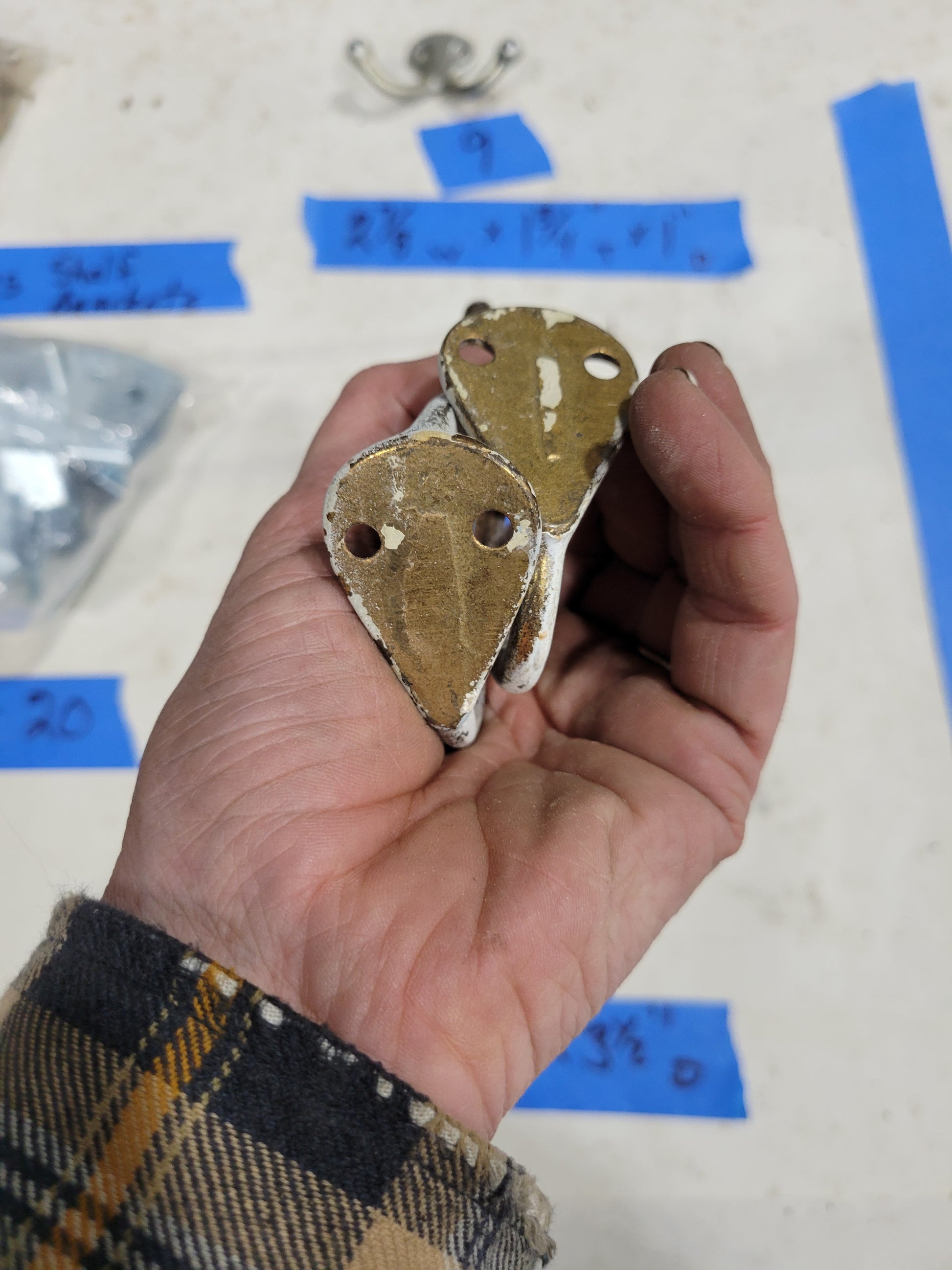 This pair of cast iron wall hooks features a pointed top hook and curved lower arm, ideal for coats, hats, or utility room storage. Finished in white paint with natural chipping and patina, these pieces have a rustic, timeworn appeal. Each hook measures 1 ¼" W x 2 ¼" T x 3 ¼" D, and both show signs of prior wall mounting with old paint residue on the bases. These sturdy hooks offer a functional accent in mudrooms, barn conversions, or vintage-inspired interiors.