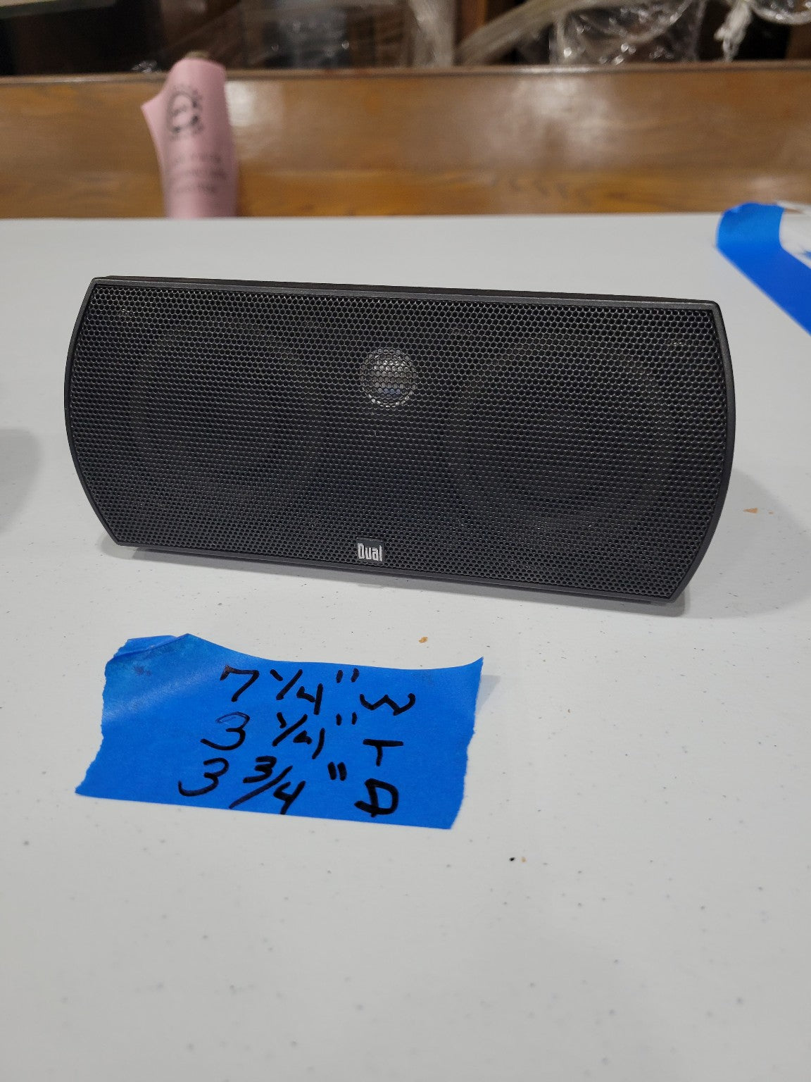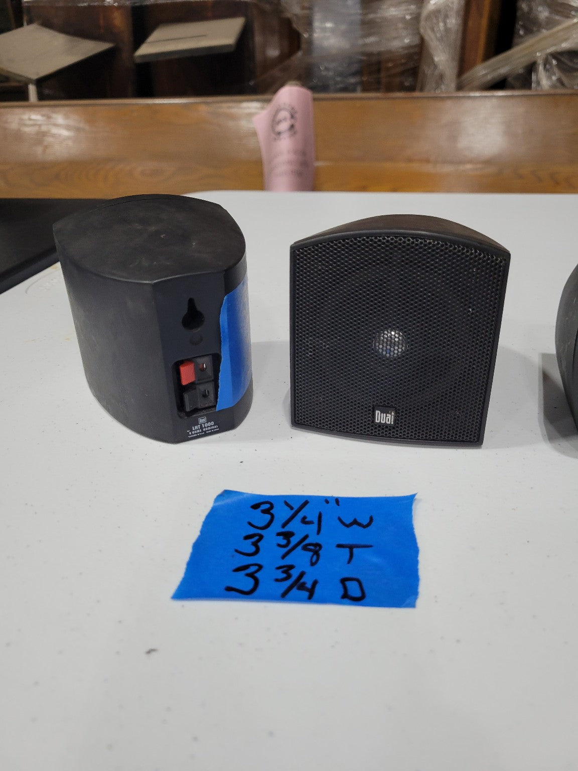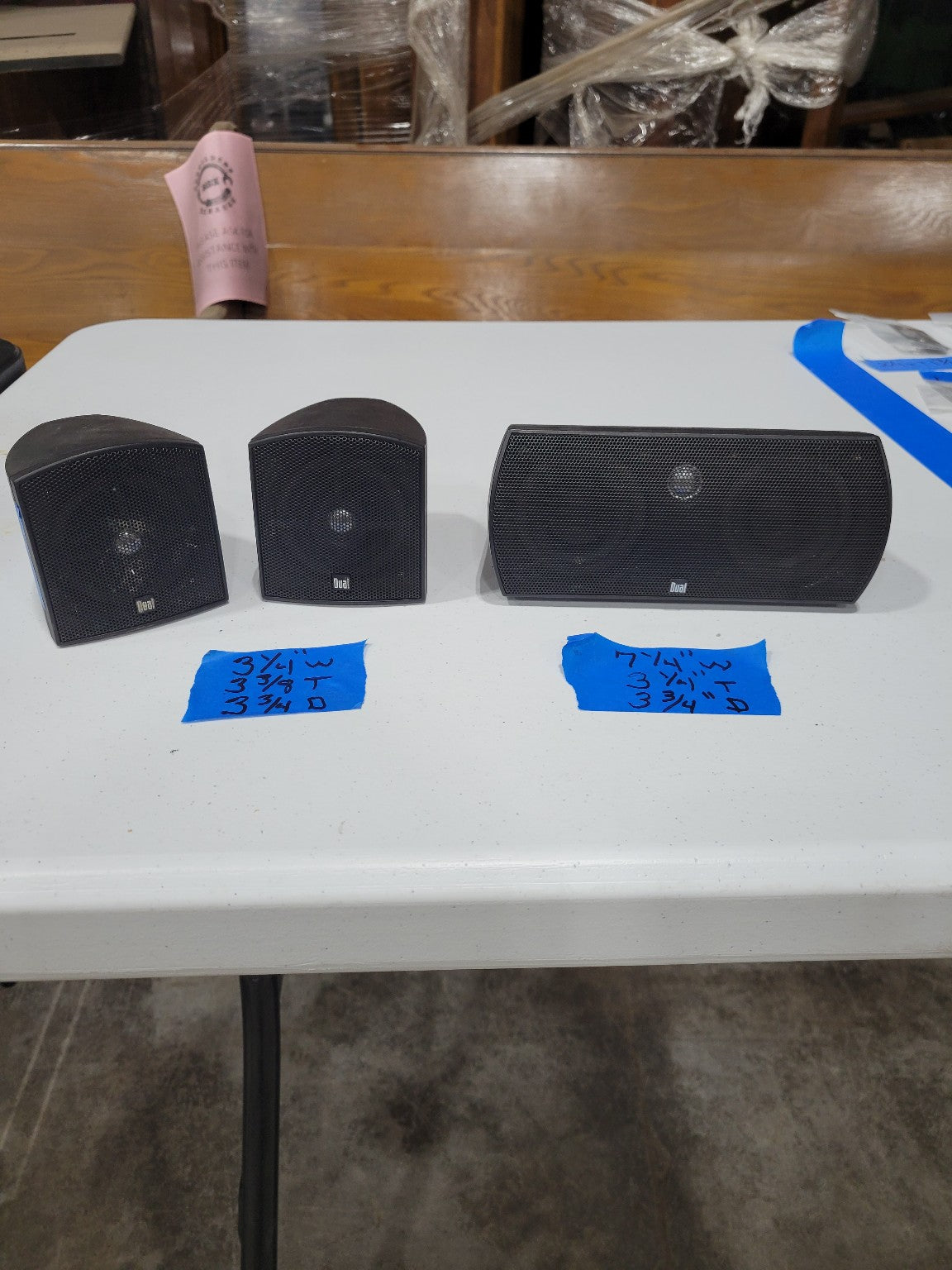 Description : Set of three compact Dual Electronics speakers, perfect for small stereo systems, home theaters, workshops, or repurposing projects. The lot includes two matching small speakers and one larger center speaker. Each unit features a black mesh grill and rear wire terminal connections. The speakers show minor surface wear consistent with use but are untested and sold as-is.