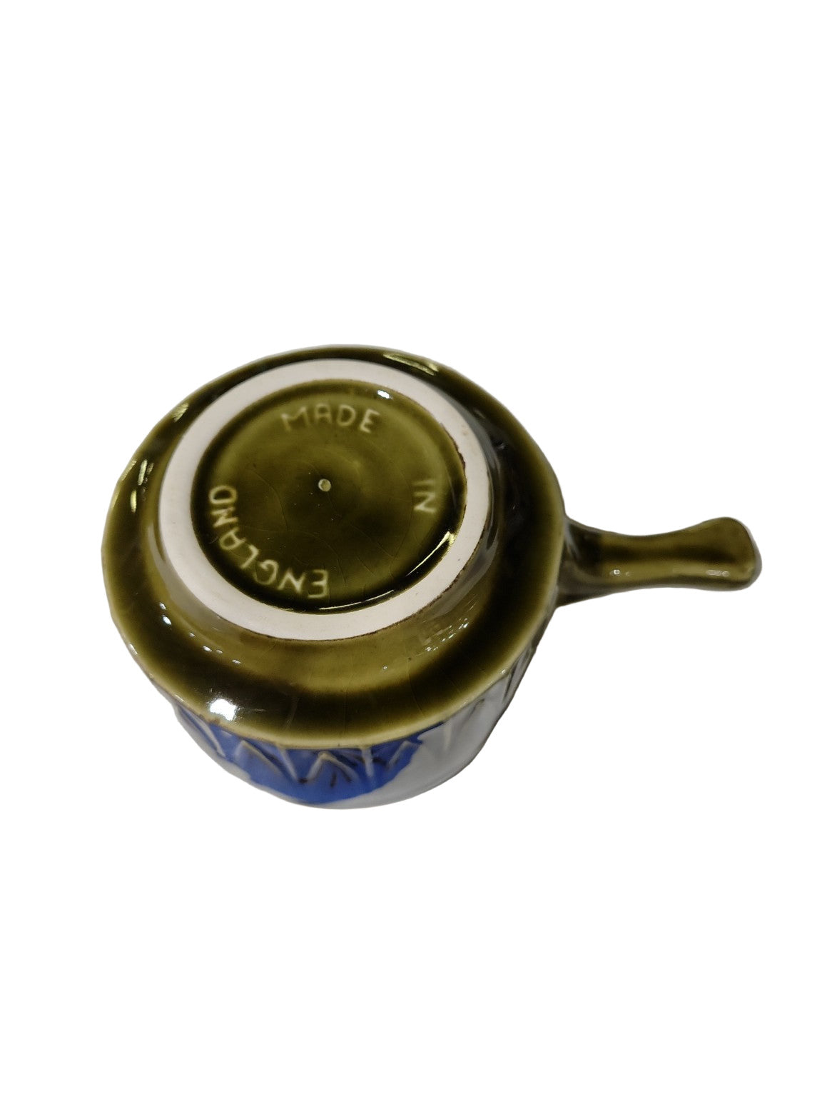 This handsome trio of mid-century stoneware handled soup bowls features a rich olive-green glaze with a diamond-embossed exterior pattern and integrated side handles for serving. Each bowl is marked “Made in England” on the base, indicating quality British craftsmanship. The glossy glaze and textured motif reflect the mid-century design movement’s blend of functionality and artistic surface treatment. Perfect for soups, stews, or as stylish serving pieces for rustic or retro-inspired kitchens.