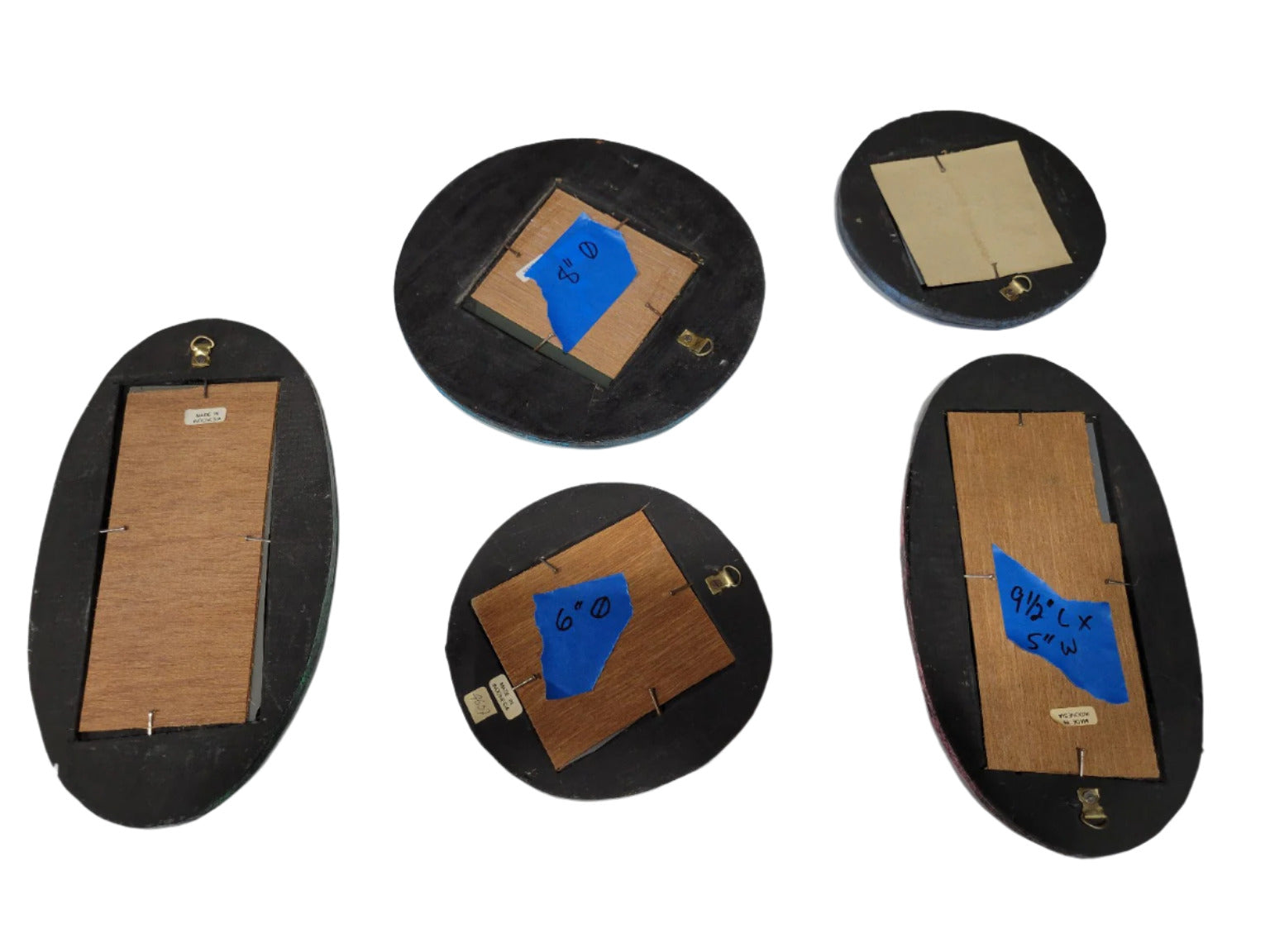 This colorful collection features five unique small wall mirrors, each set in a shimmering hand-painted frame with an iridescent metallic finish. The group includes three oval and two round mirrors in vivid jewel tones—green, pink, blue, turquoise, and black—perfect for adding pops of reflective color to gallery walls, dressing areas, or eclectic interiors. Each piece has a small hanging hook affixed to the back and is lightweight, ideal for renters or decorators looking for flexible styling options. Signs of light wear consistent with handling and minor aging.
