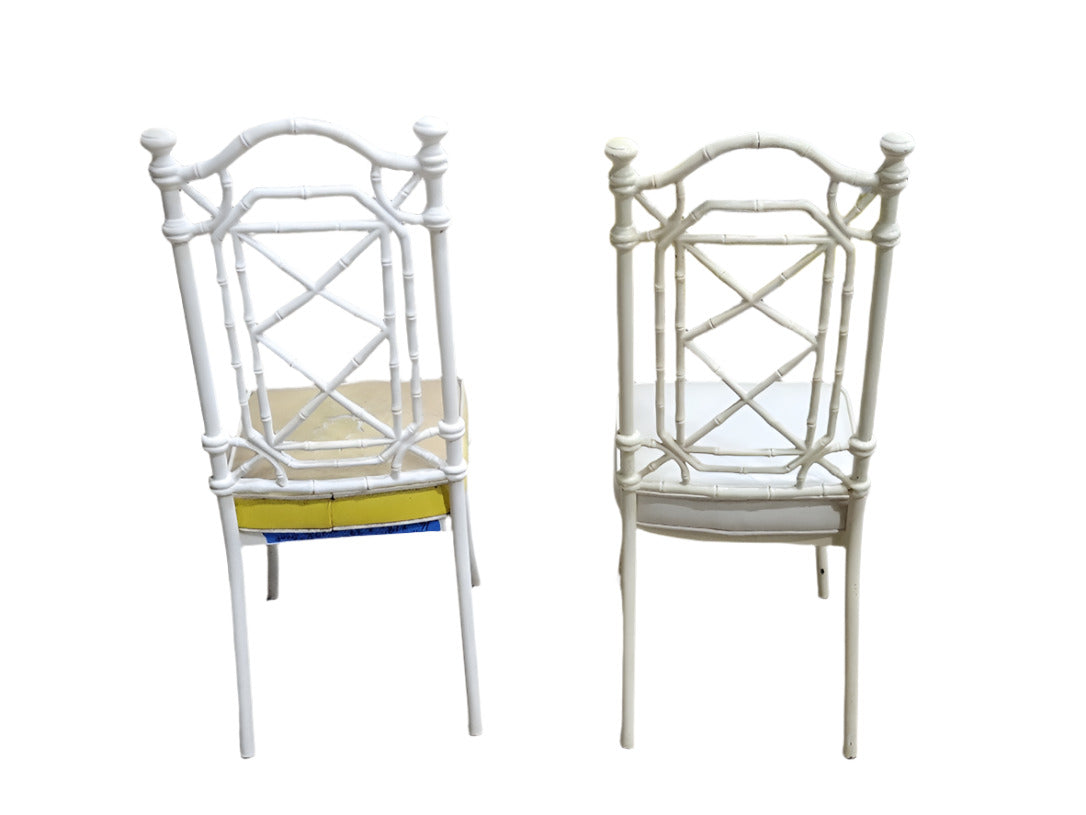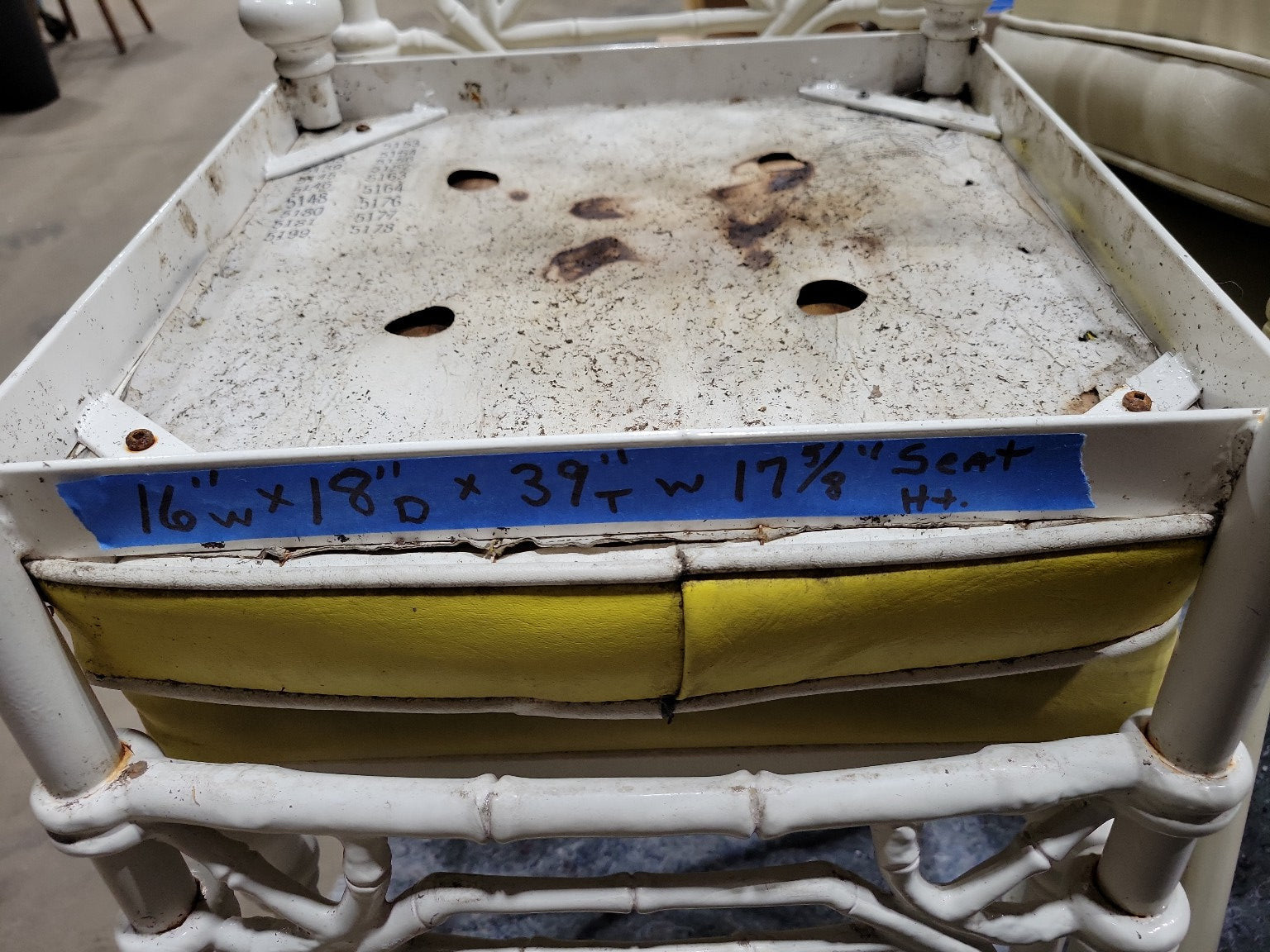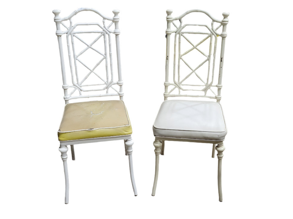 Description : This striking set of six dining chairs is crafted from tubular metal shaped in a faux bamboo pattern and finished in white paint. Each chair features a crisscrossed back design with ornamental finials and turned-style front legs. The yellow and white vinyl seat cushions show signs of age with visible cracking and discoloration, indicating vintage wear. The seat bases are solid and metal, making these chairs highly durable and ideal for indoor dining or as accent pieces. With a classic Palm Beach Regency aesthetic, they evoke the playful luxury of 1960s–70s resort decor. These would shine with new upholstery but still make a bold statement as-is.