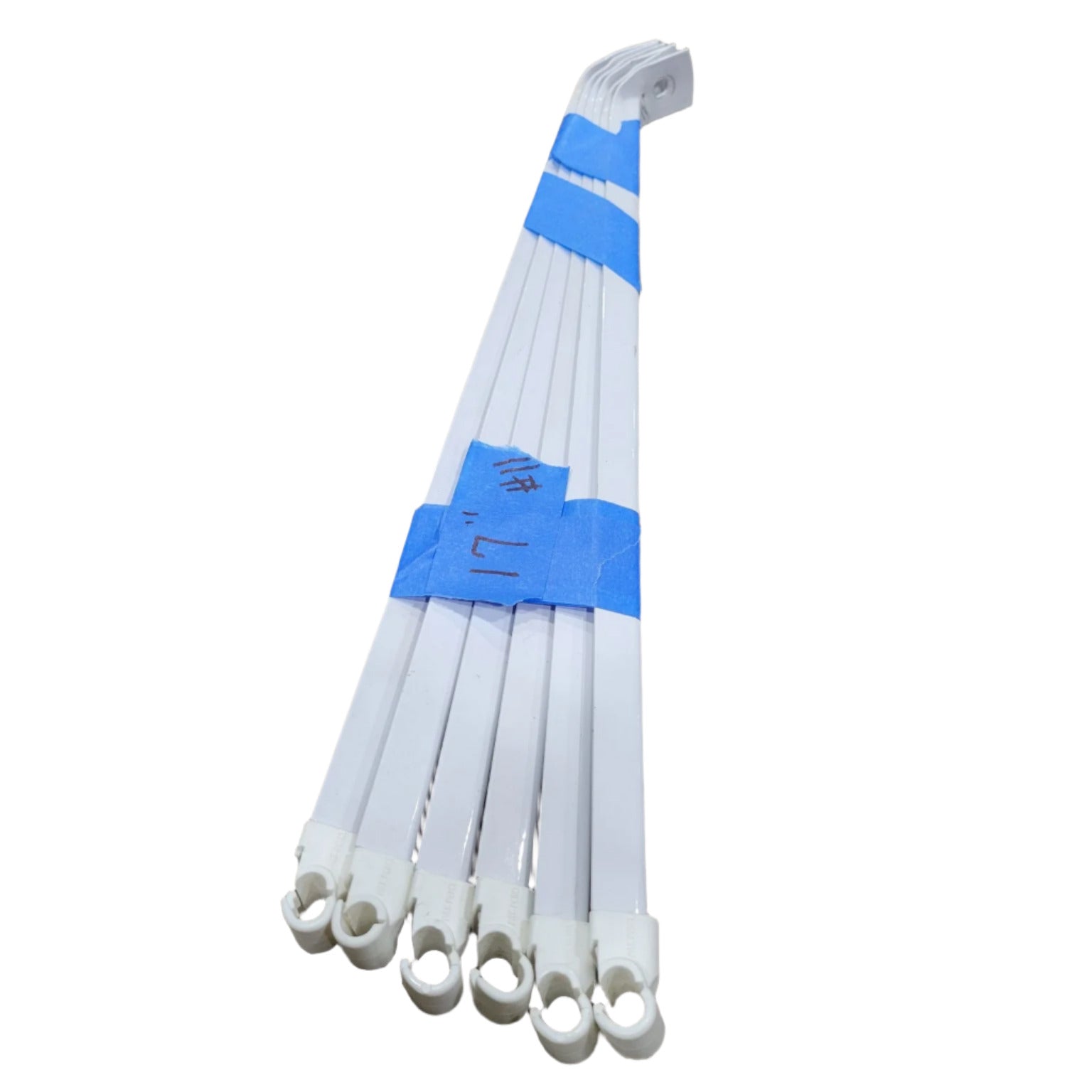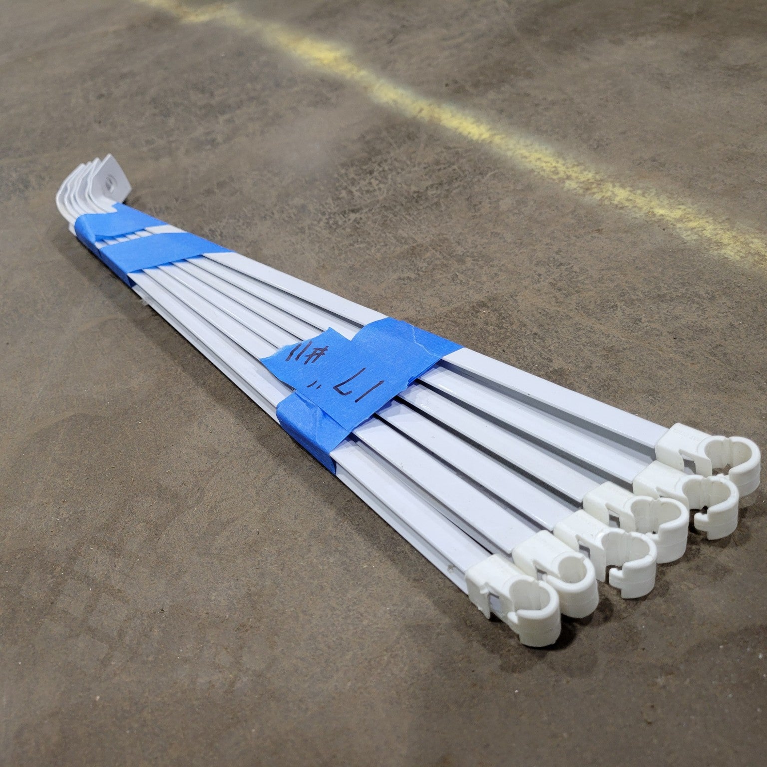 This set of six white metal shelf brackets is designed for supporting wall-mounted shelves, providing a sturdy and practical solution for organizing storage spaces. Each bracket measures 17 inches in length and features a pre-curved design with built-in mounting points for secure installation. The white powder-coated finish offers a clean, neutral look that blends well with various décor styles, making them ideal for home, office, or workshop use.