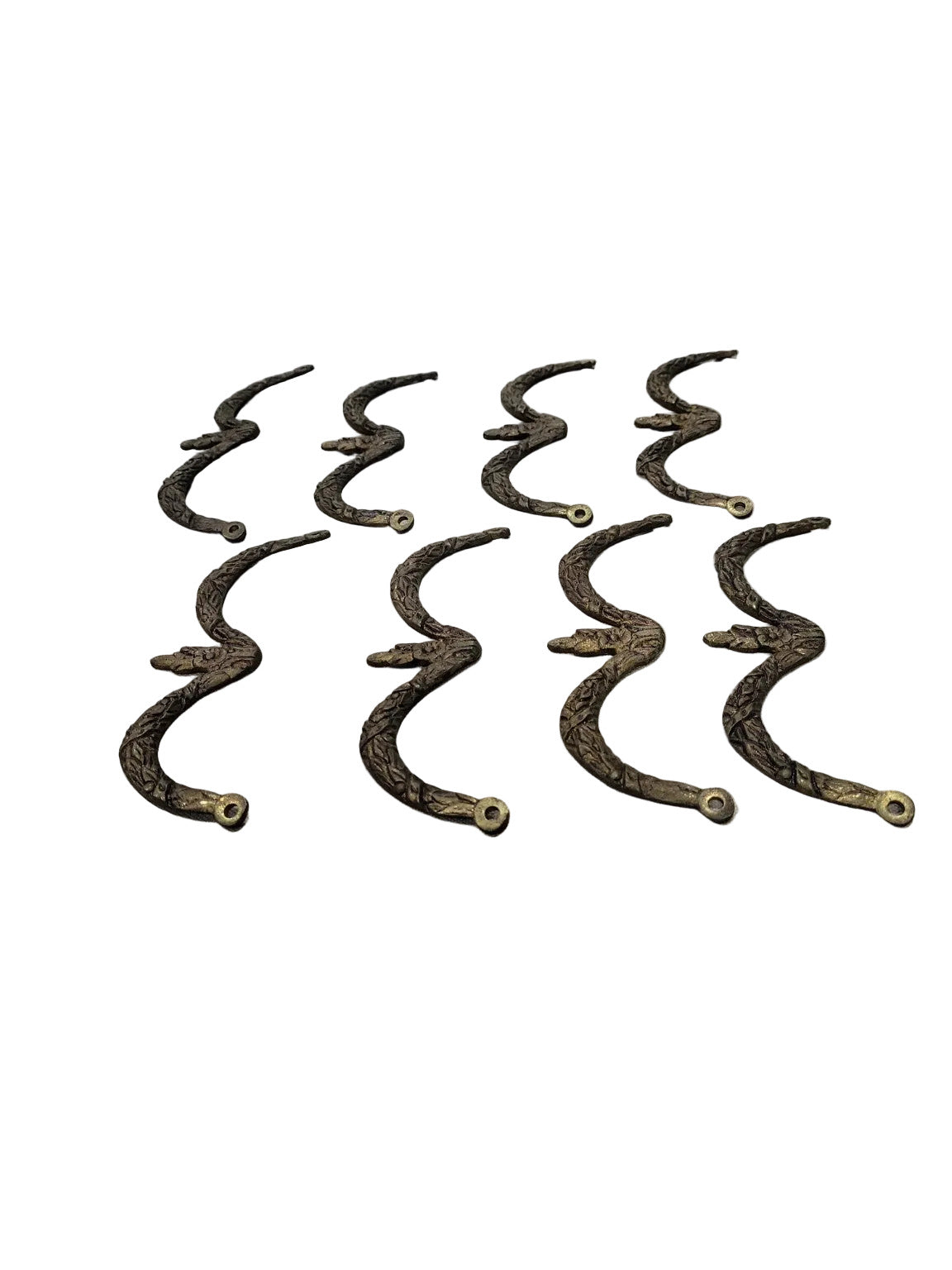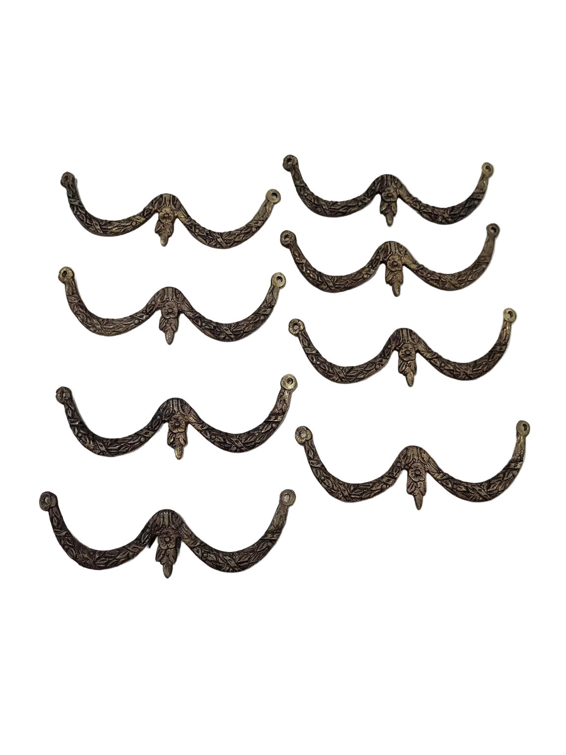 Description : This is a complete set of 8 vintage brass drawer pulls featuring an elegant swag-style floral motif. Each handle is cast in solid brass and showcases intricate raised leaf and flower detailing with a central bloom and flowing ribbon-like form. Perfect for restoring antique furniture or adding a decorative upgrade to drawers or cabinets, these pulls combine durability with classic charm.