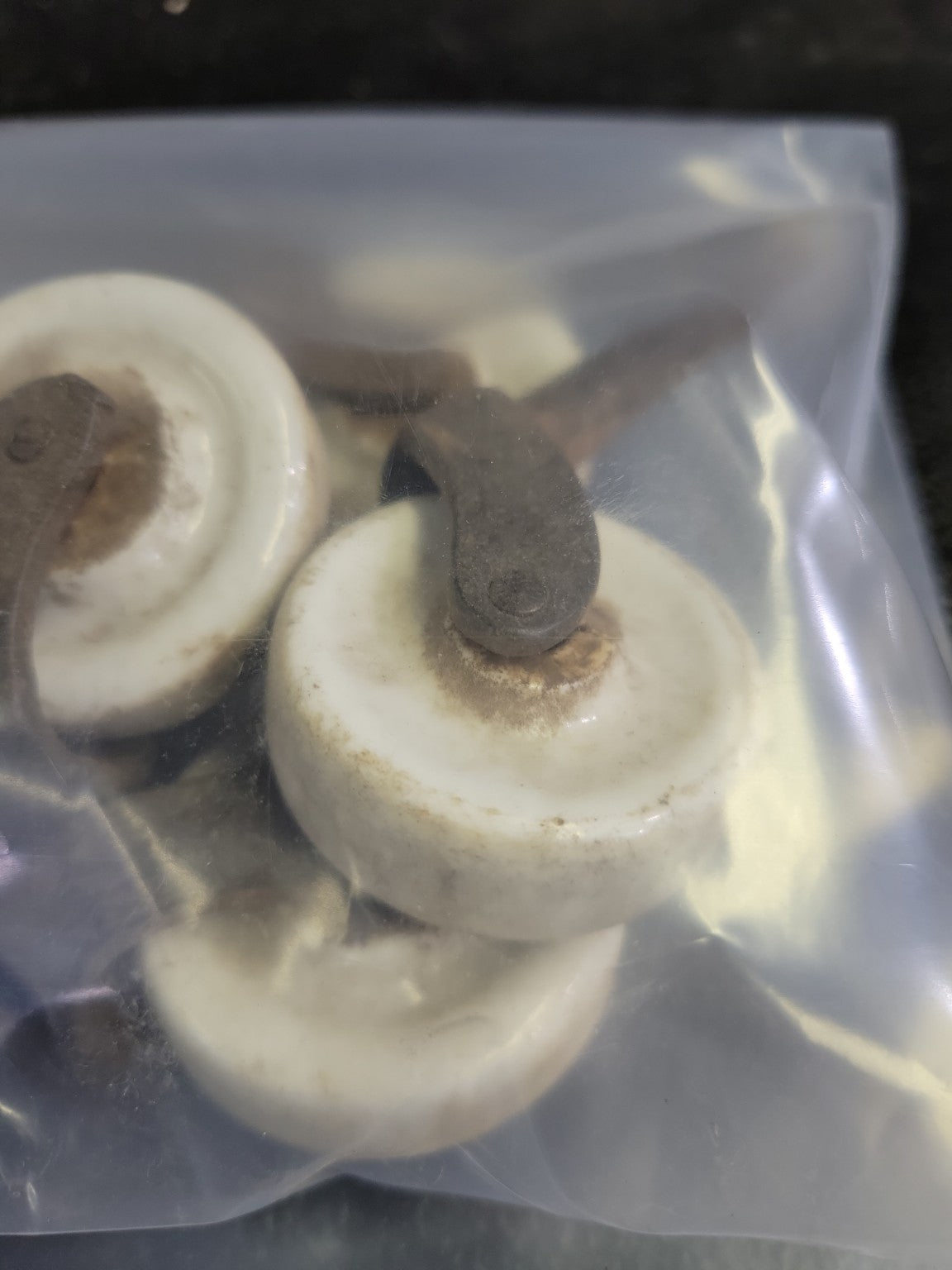 Description : Classic white porcelain wheel casters with metal yokes, perfect for antique furniture restoration. These traditional-style casters add authenticity and charm to vintage chairs, dressers, and tables.