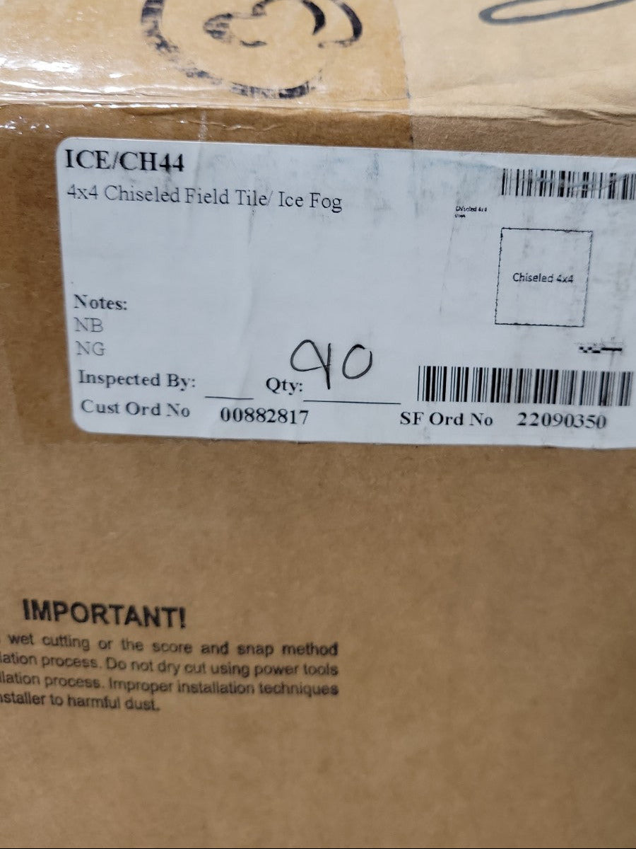 This is a set of 92 ceramic tiles in a 4" x 4" square format, featuring a glazed finish in a soft Ice Fog white tone. Each tile has a chiseled edge, offering a handcrafted look that softens the grid effect when installed. These tiles are well-suited for backsplashes, bathroom walls, fireplace surrounds, or anywhere a classic-meets-contemporary aesthetic is desired. Labeled as ICE/CH44 – Chiseled Field Tile, they combine subtle texture with clean geometry.