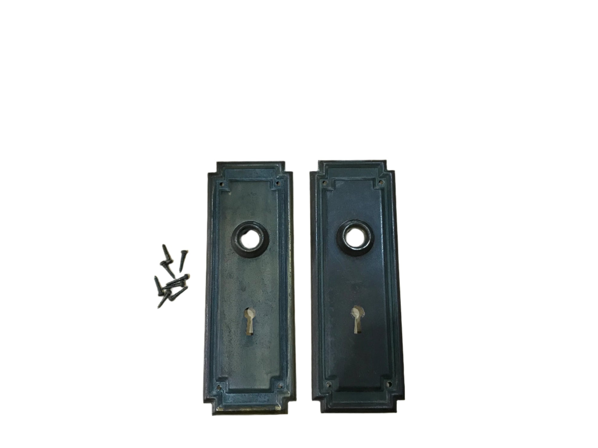 This is a set of two antique cast iron door backplates featuring a classic keyhole design. The plates exhibit an elegant, stepped border detail, lending them a subtle Art Deco aesthetic. The set includes the original screws for easy installation. The aged patina and darkened finish suggest a long history of use, making these backplates an ideal choice for restoring antique doors or adding a vintage touch to modern interiors.