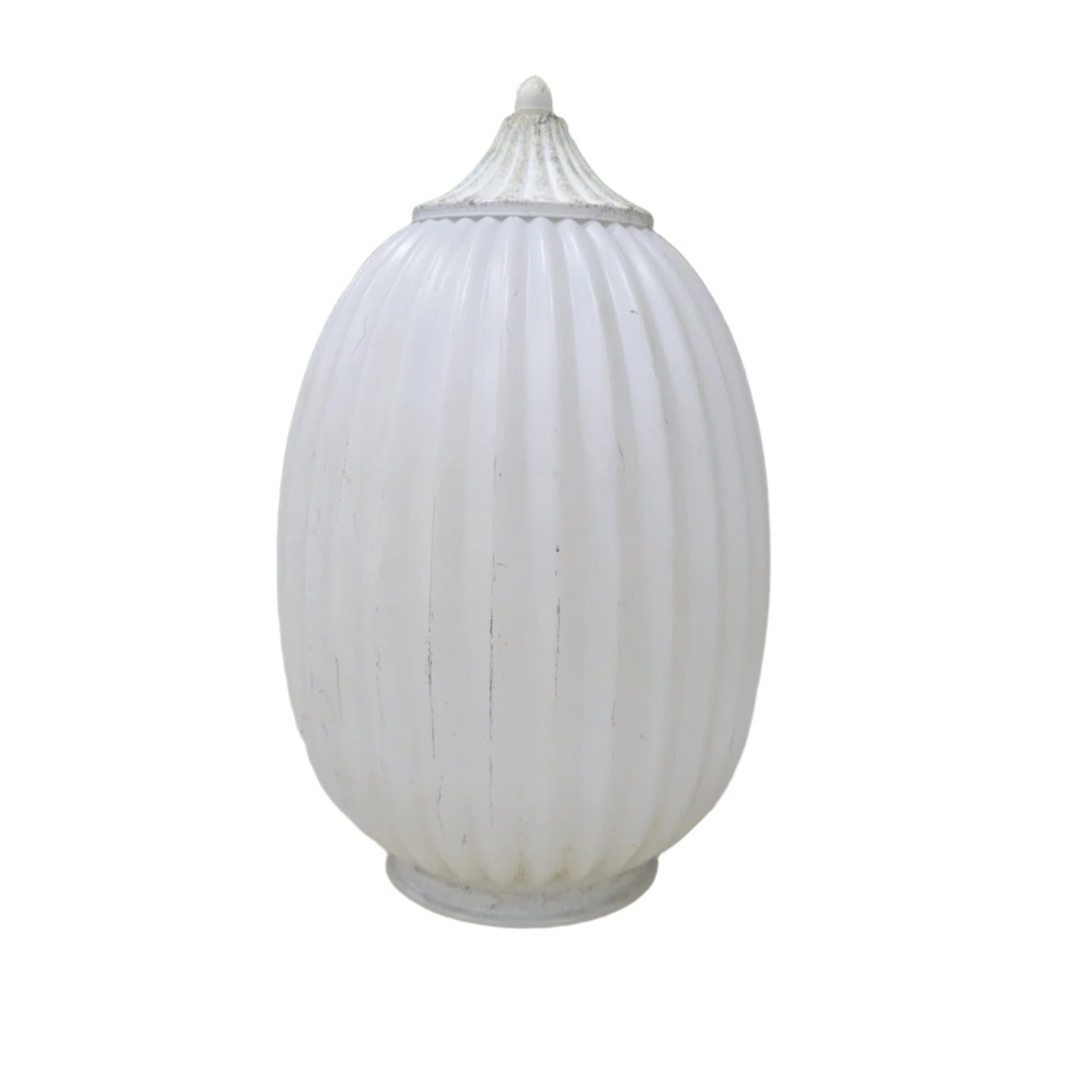 A set of three vintage ribbed white glass light globes with decorative metal finials. These globes have a classic fluted design, making them ideal for pendant lights, ceiling fixtures, or restoration projects. The ribbed texture diffuses light softly, providing a warm and inviting glow.