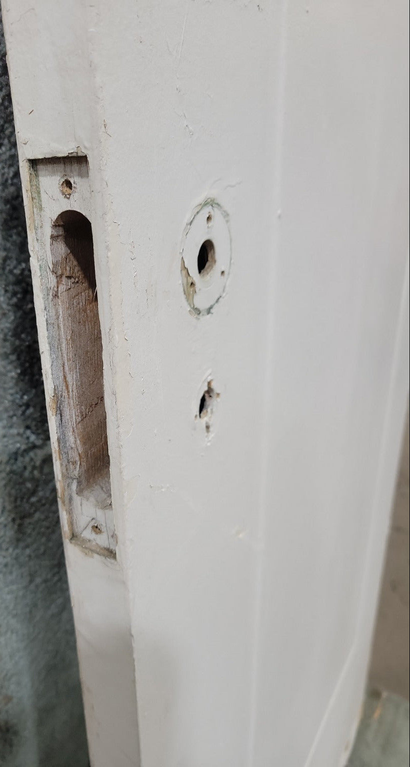 This solid wood door features a single shallow recessed panel and a painted white finish. Measuring 25 ¾" W x 79 3/8" H x 1 ½" D, it offers a classic, understated look suitable for utility rooms, closets, or minimalist interior spaces. The door has been previously drilled for knob and latch hardware, and shows signs of wear at the bottom and along the edge—ideal for a DIY refurbishing or reuse project. Its slightly wider width makes it well-suited for replacing non-standard door sizes in older buildings.