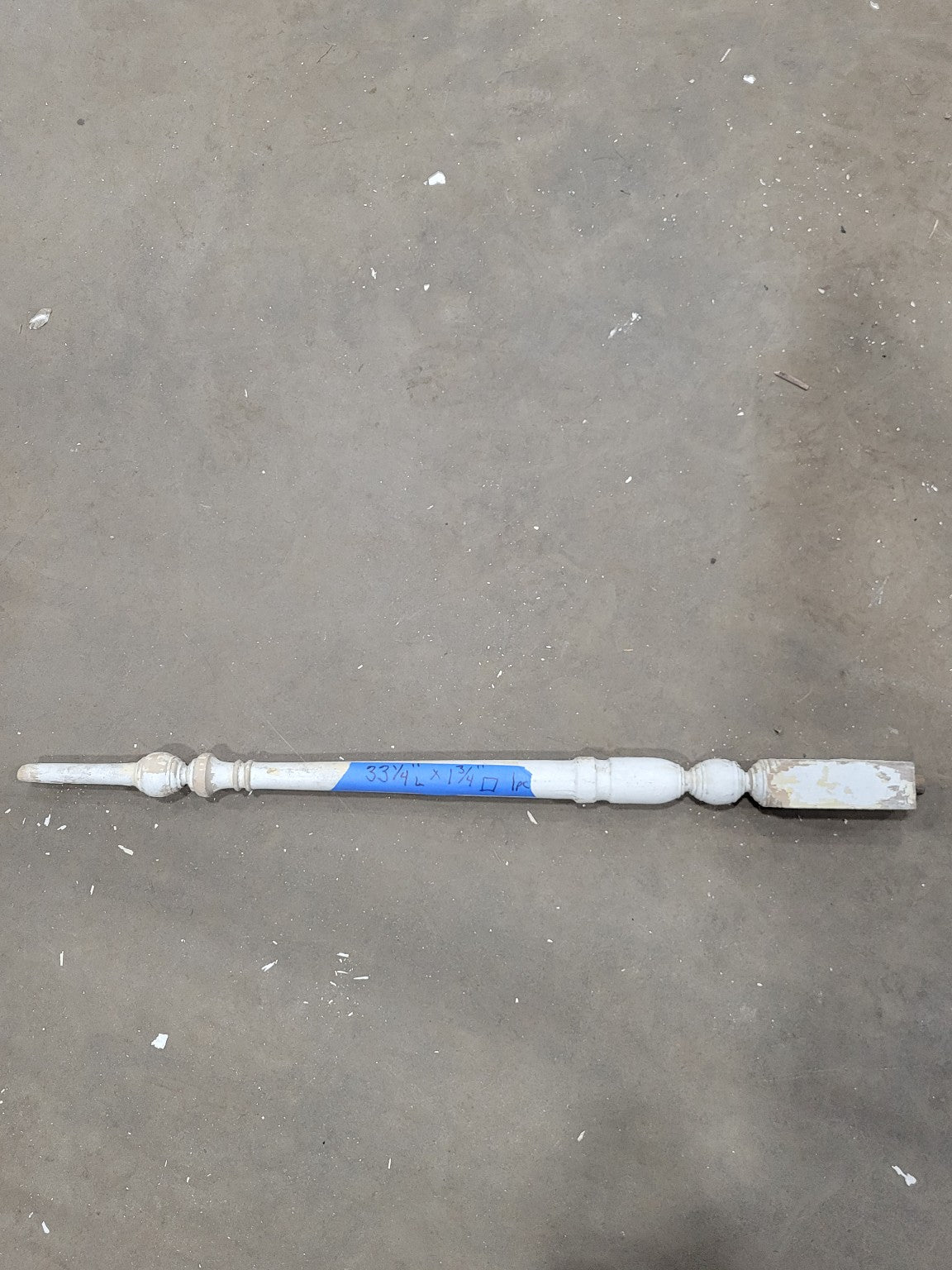 Description : This listing offers one salvaged vintage turned wood stair baluster, finished with a worn white paint for a truly authentic aged look. Measuring approximately 33 ¾" in length and featuring a 1 ¾" square end, this spindle showcases elegant lathe-turned detailing and historical charm. Ideal for restoration projects, DIY furniture making, or standalone decorative use, the natural paint wear reveals both history and craftsmanship.