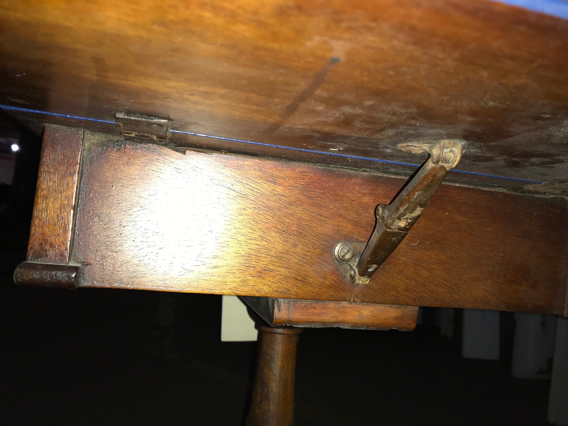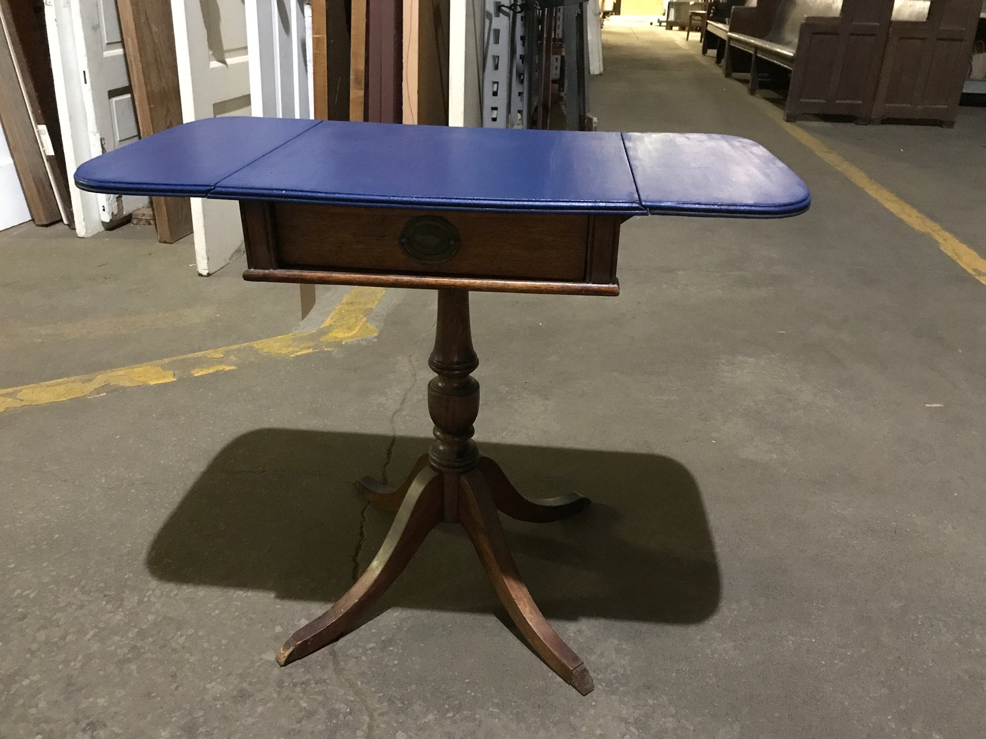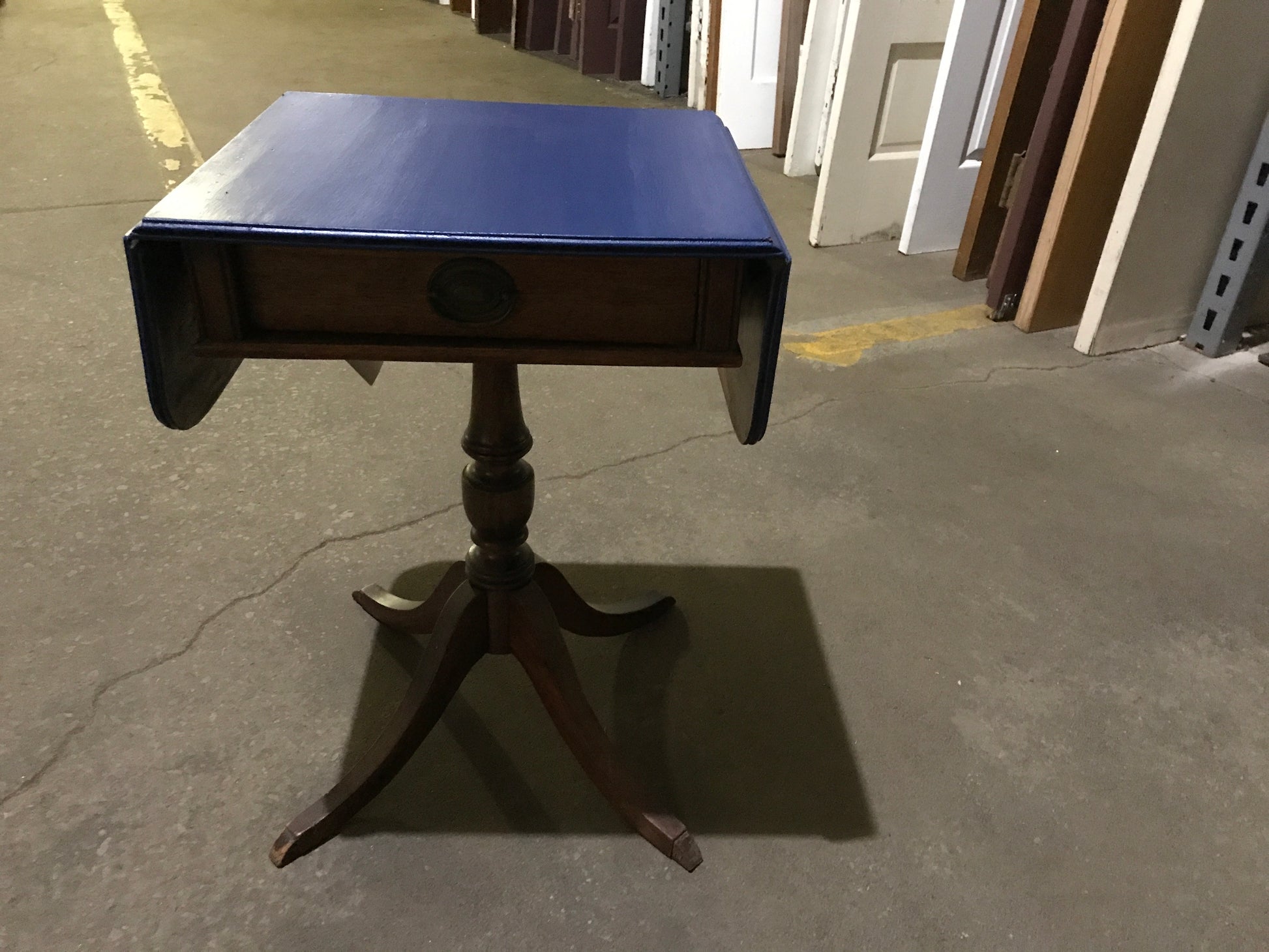 Description : Small Side Table with Single Drawer and Brass Hardware. Drop Sides are Hinged. Top Painted Blue, Bottom stained