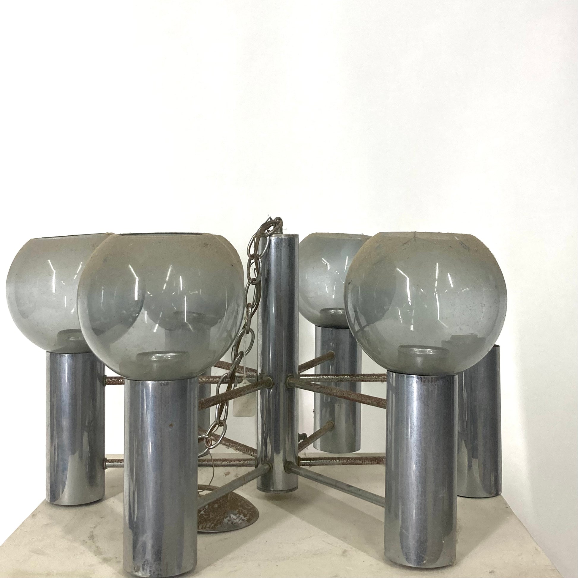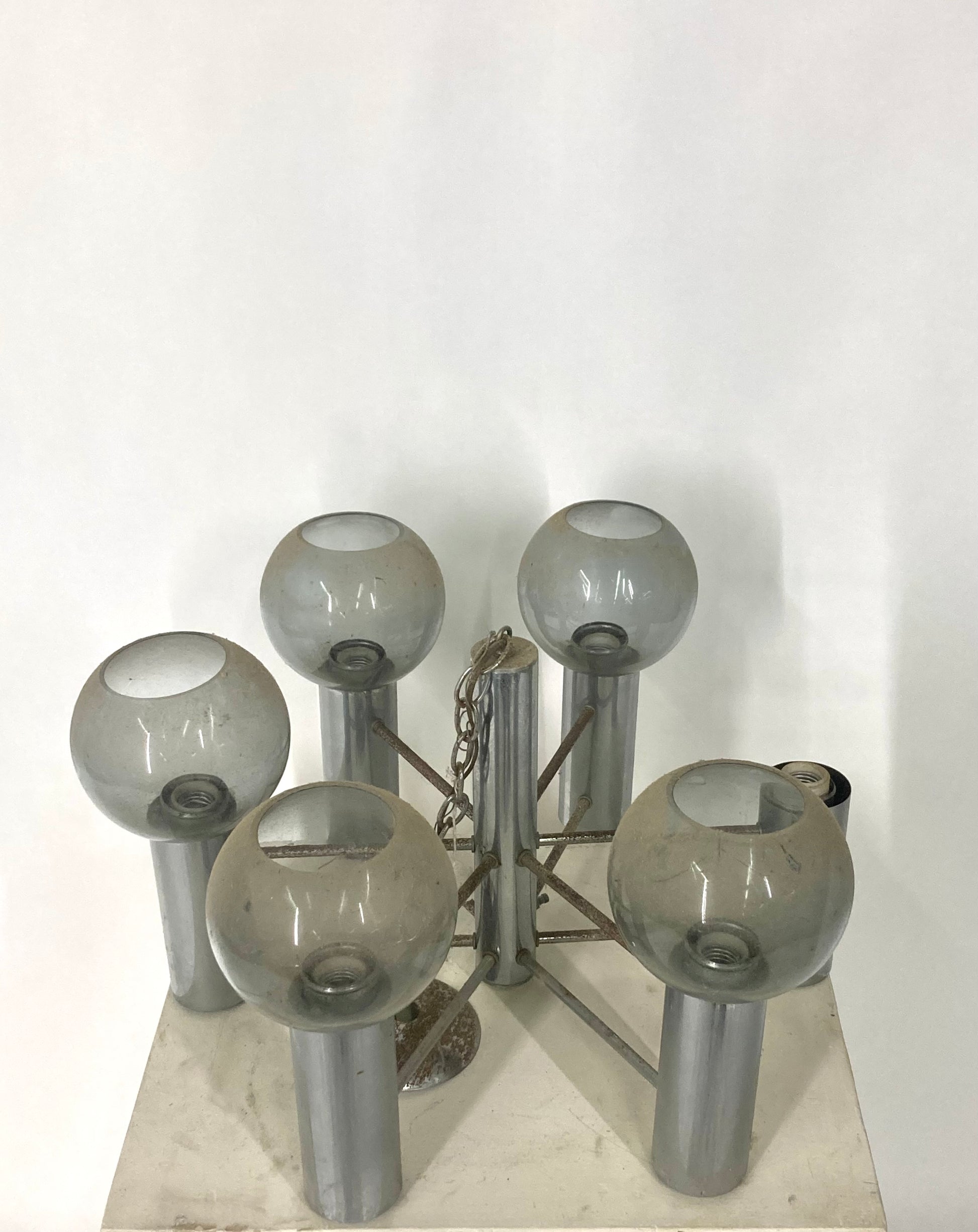 Description : Vintage Chrome, smoked glass chandelier with 6 bulbs and five light shades.