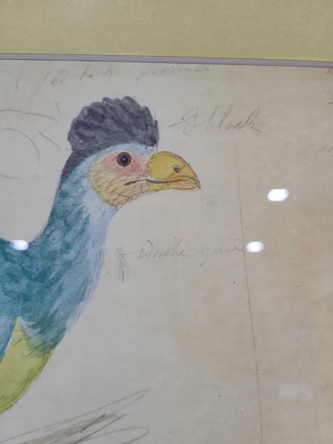 Printed reproduction of a watercolor and graphite bird study, custom-framed under glass