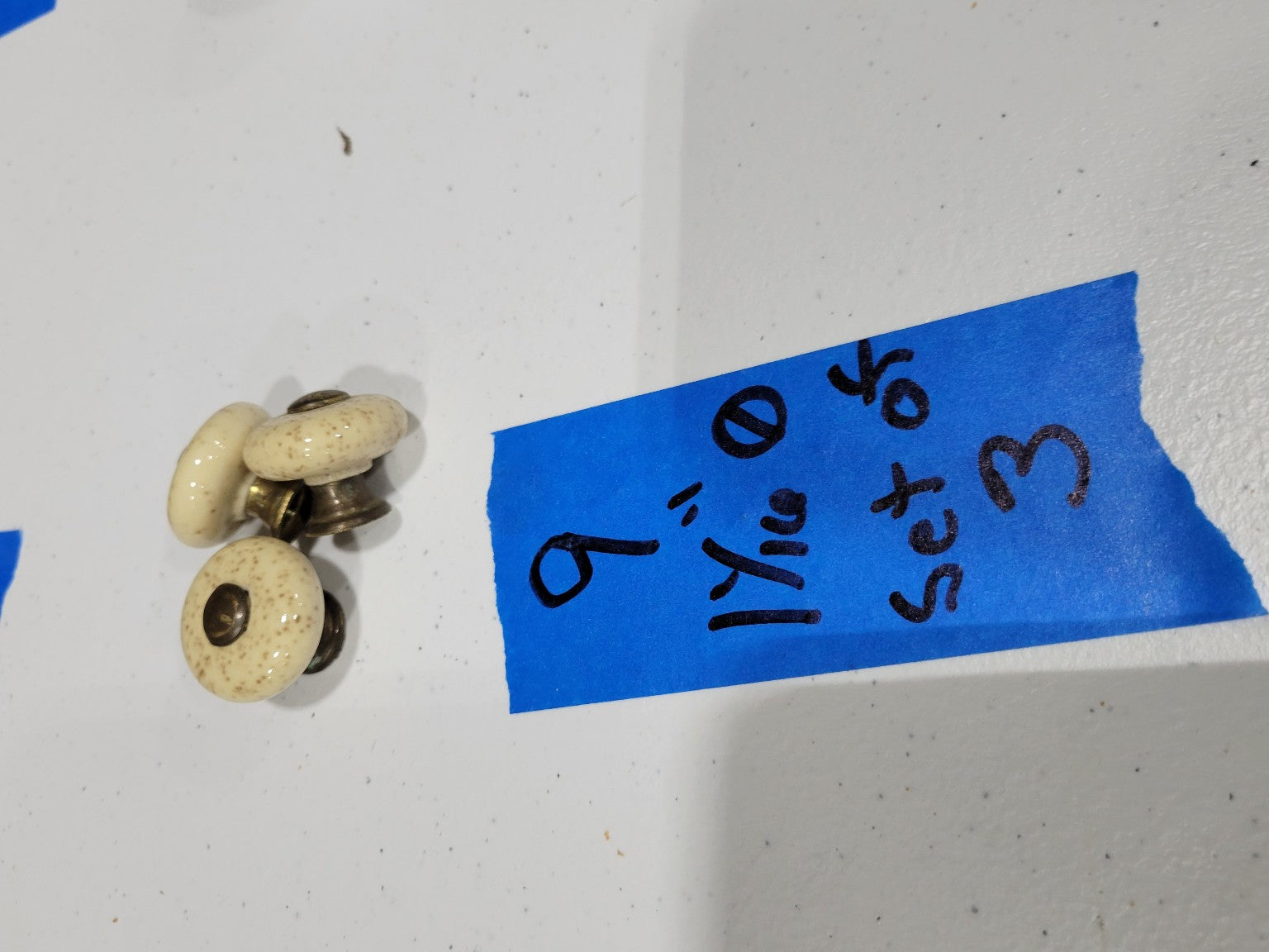 Speckled Cream Porcelain Drawer Pulls with Aged Brass Hardware – Set of 3 (1 1/16")