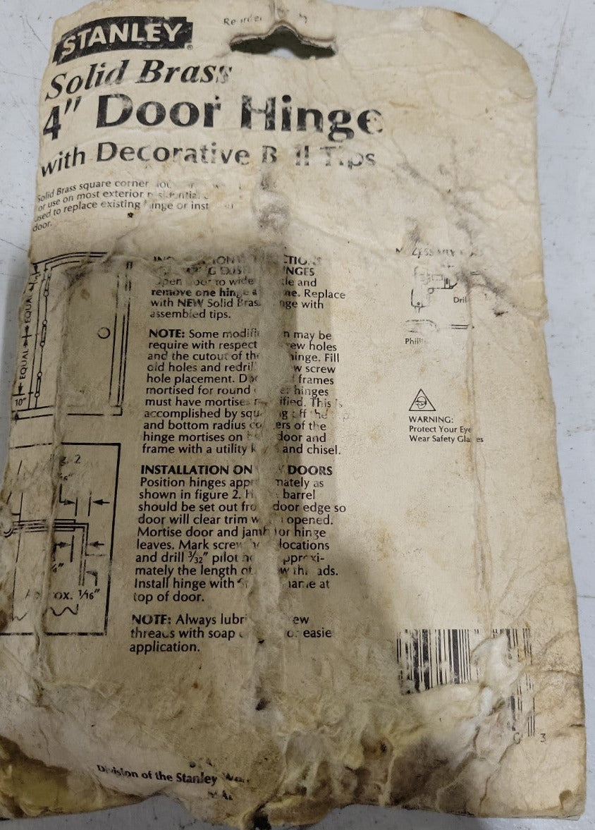This Stanley Solid Brass 4-inch Door Hinge comes new old stock (NOS) in its original retail packaging, marked CD749BT (US3 Bright Brass). Made in the USA by The Stanley Works, this hinge features decorative ball-tip finials and a square-corner plate design, ideal for traditional and restoration-style doors. The hinge is accompanied by its original brass screws, still attached to the package. Although the paper packaging shows heavy age wear and staining, the hinge itself remains unused, showing light surface oxidation consistent with long-term storage.
