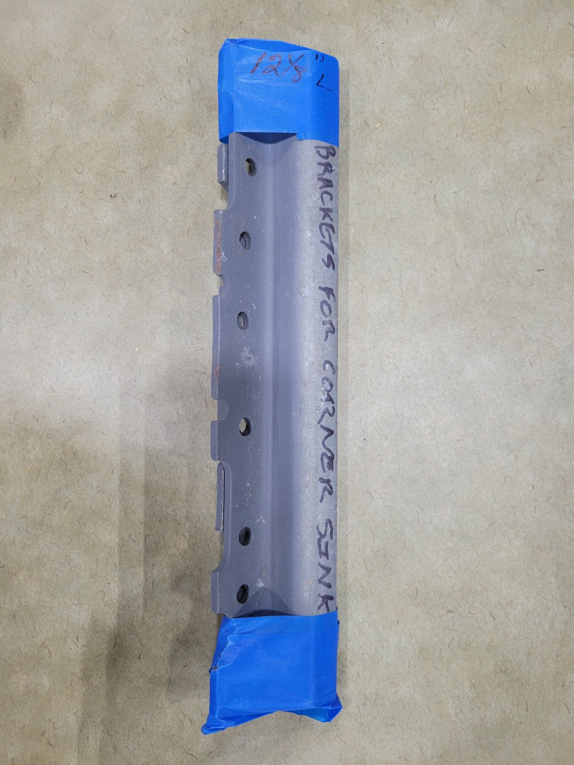 This heavy-duty steel bracket is designed for supporting wall-mounted corner sinks. The notched mounting edge and pre-drilled holes suggest compatibility with a range of sink styles, particularly older cast iron or porcelain units. The gray finish appears to be primer-coated, making it ready for painting or rust-prevention treatment. It’s a practical, industrial-grade support solution for utility sinks in garages, basements, or vintage bathroom restorations.