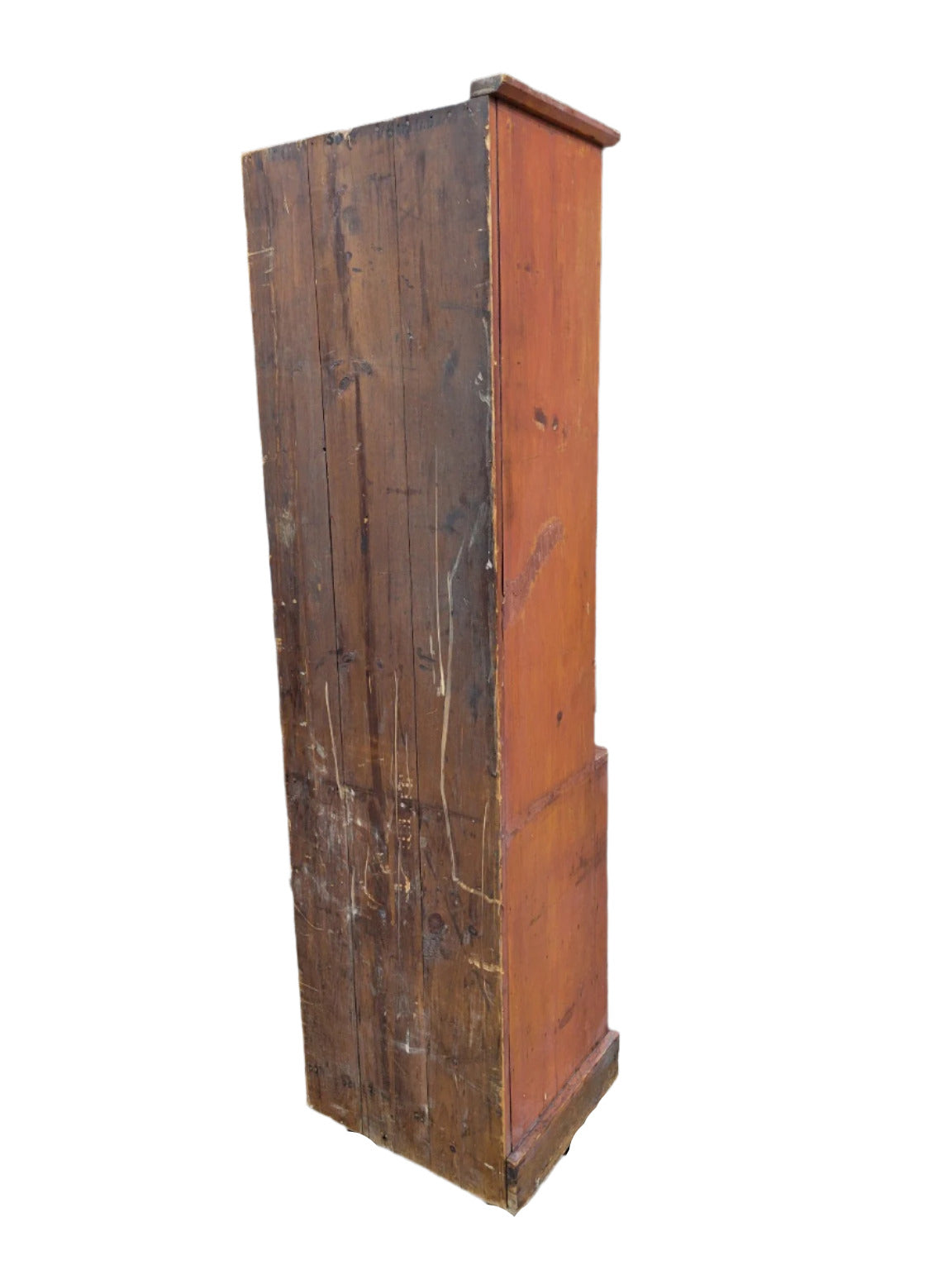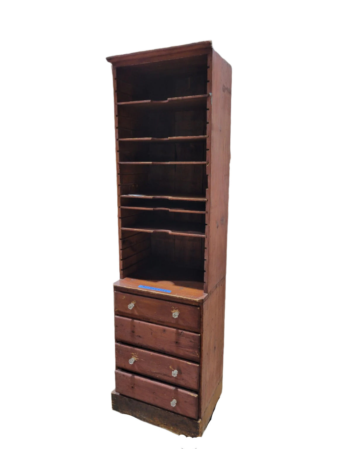 Crafted from solid wood and finished in a reddish-brown stain, this tall vintage cabinet features four glass-knobbed drawers and multiple adjustable upper shelves designed for paper or tool organization. It has a raw, utilitarian character that suits workshop, studio, or archival storage. Mounted on casters, it’s easy to move and repurpose. The back shows signs of age and wear, adding to its authentic charm.