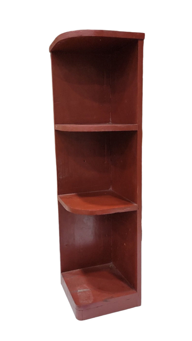 This compact, freestanding corner shelf is finished in a rich rustic red tone and features three triangular display tiers with smooth, curved fronts. Designed to fit snugly in a corner, the piece has a solid back panel and handcrafted construction, including subtle imperfections and patina from use. It's ideal for showcasing plants, pottery, or collectibles in small spaces like entryways, bathrooms, or kitchens. Minor scuffing and wear is present, consistent with light use and adding to its authentic character.