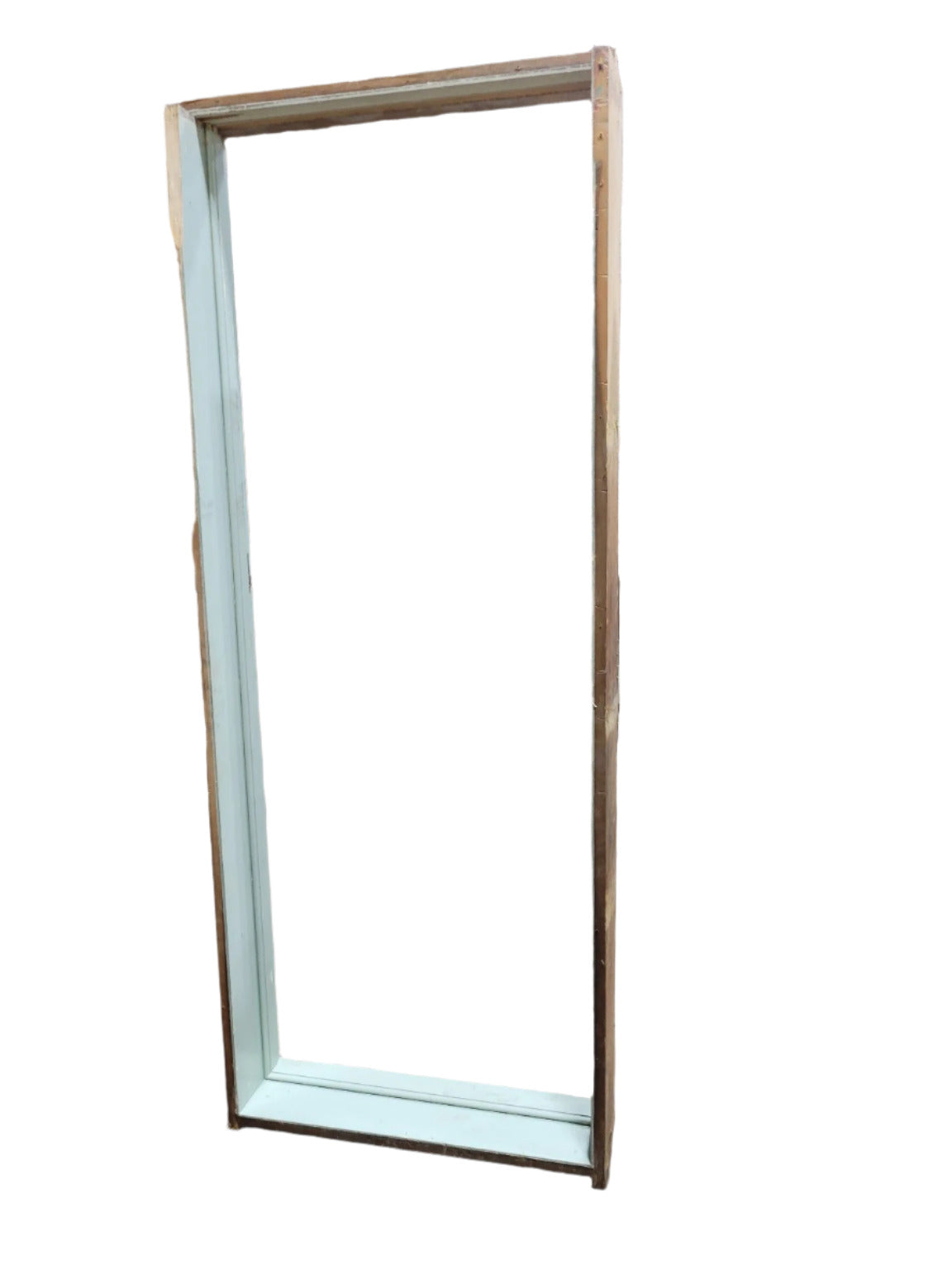 This vintage left-hand door frame is built to house a standard 30" x 80" door, with an extended jamb height of 84" to accommodate tall trim or header applications. Painted in a pale mint green on the interior side and raw wood on the exterior, the frame shows signs of reuse, including exposed fastener holes and minor wear. Solid and square, it is ready for refinishing or direct reuse in restorations or custom builds.