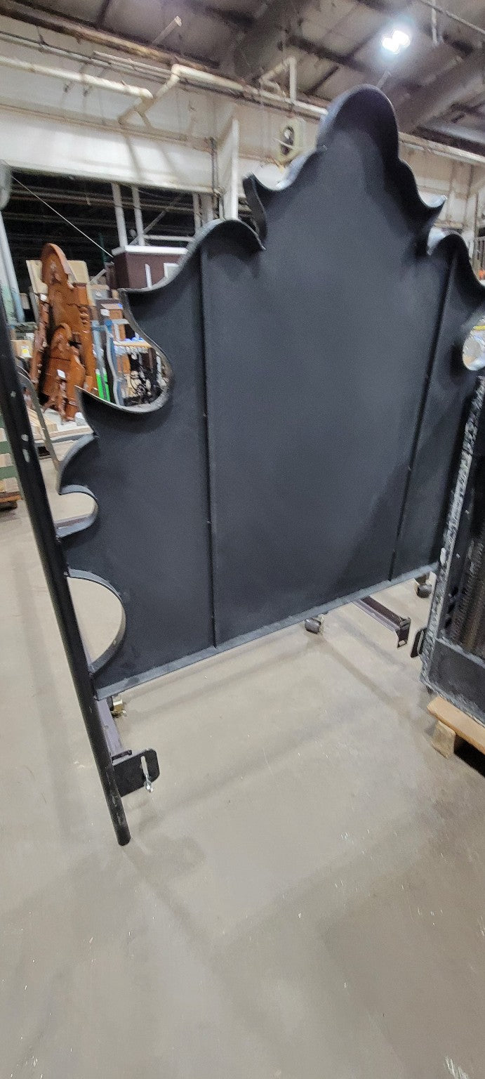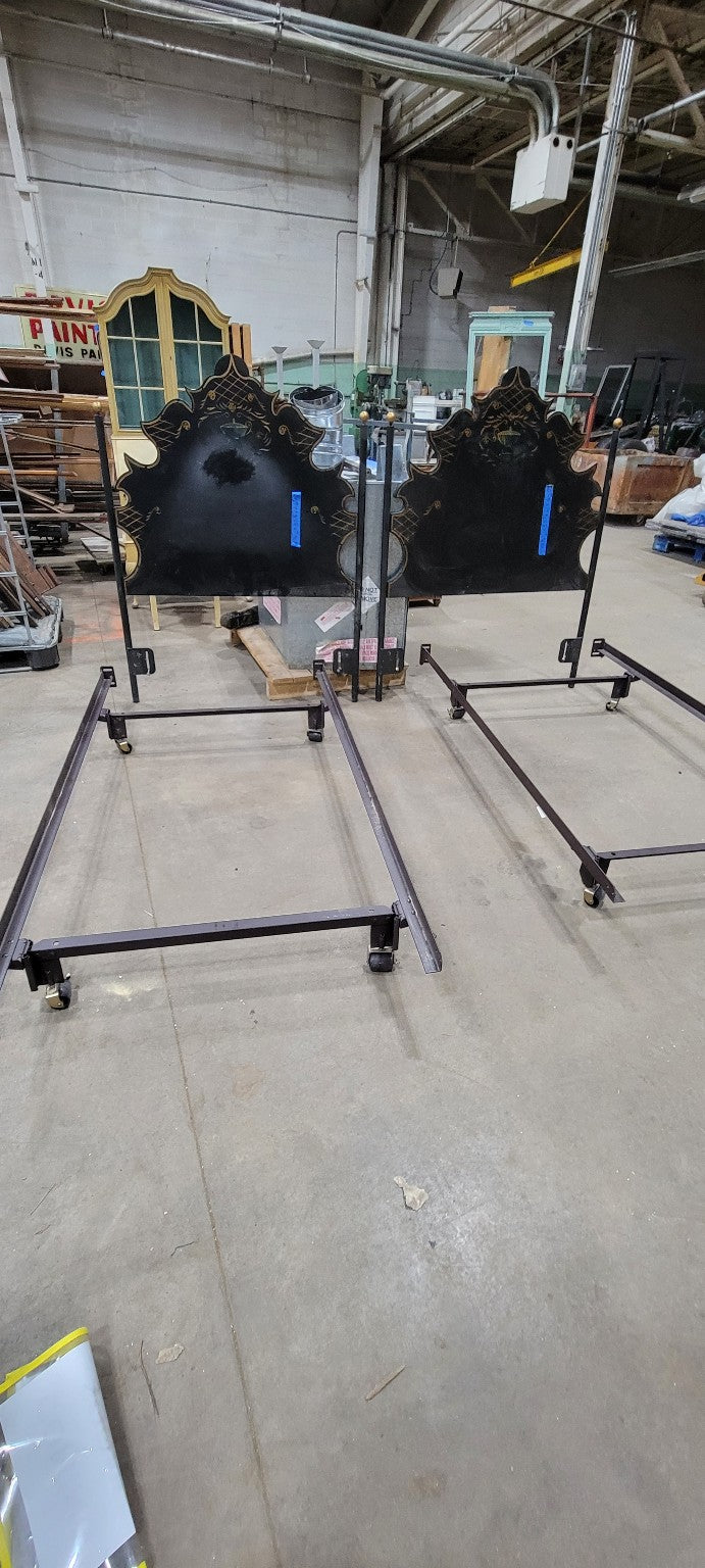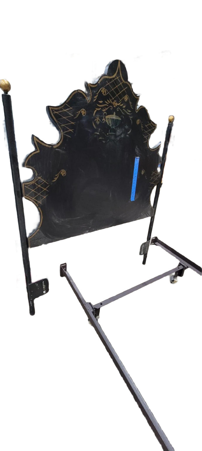 Elegant twin-size metal bed frame featuring a dramatically shaped wooden headboard with hand-painted golden accents. The design showcases a black lacquer-style finish, scalloped silhouette, and neoclassical flourishes including urn and scroll motifs. Ideal for eclectic interiors or restoration-inspired spaces.