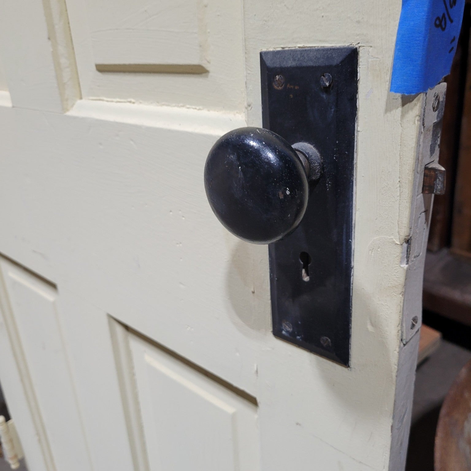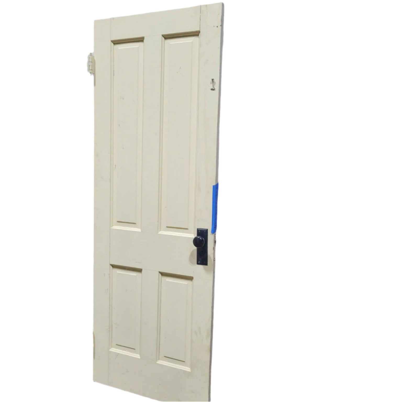 This is a four-panel wooden door with a cream-painted finish. It features black hardware, including a round doorknob and a rectangular escutcheon plate with a keyhole detail. The simple yet timeless design makes it suitable for vintage or restoration projects.