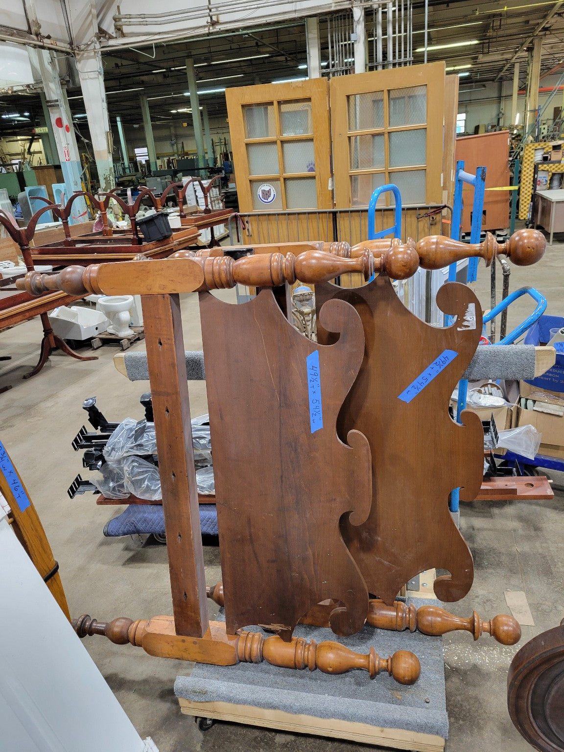 Description : This full-size antique bed frame showcases a rare and historically significant rope-slat construction, where side rails connect the headboard and footboard using a laced rope support system—predating metal spring frames. The headboard features beautifully turned spindles, refined paneling, and an oval marquetry inlay of delicate floral motifs. The footboard offers deep scroll-cut shapes and coordinating turned finials, all carved from solid hardwood. This bed’s craftsmanship and character make it a standout example of pre-industrial furniture. With original wear and a few surface imperfections, it remains structurally sound and is perfect for restoration, display, or adaptive reuse.
