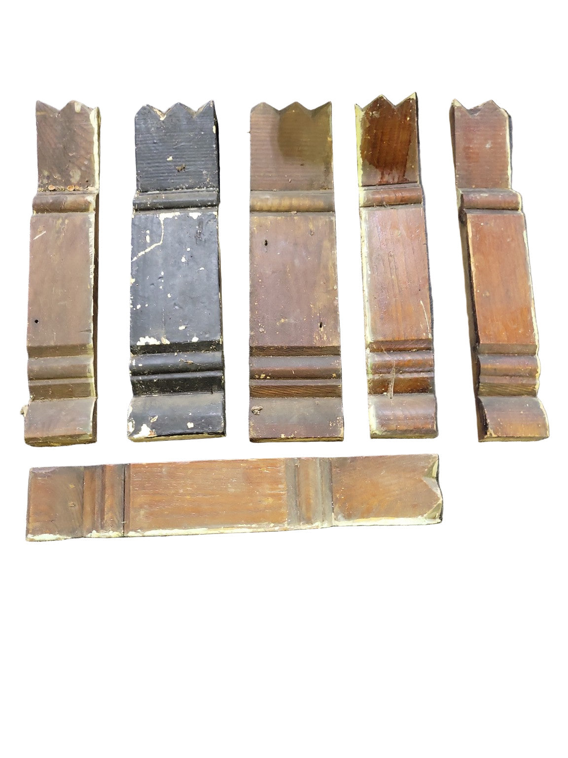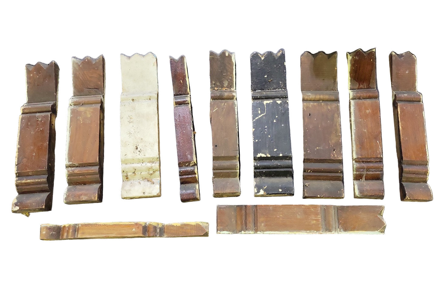 These salvaged Victorian plinth block cutoffs range in width from 2¼" to 3", with lengths averaging 12⅞" and a standard depth around 1". Each block features classic period-accurate moulding, including beaded and stepped profiles, topped with a notched peak. Though shorter or damaged, these pieces retain the original detail and character ideal for patchwork, trim replication, small craft projects, or historic restoration fill-ins.