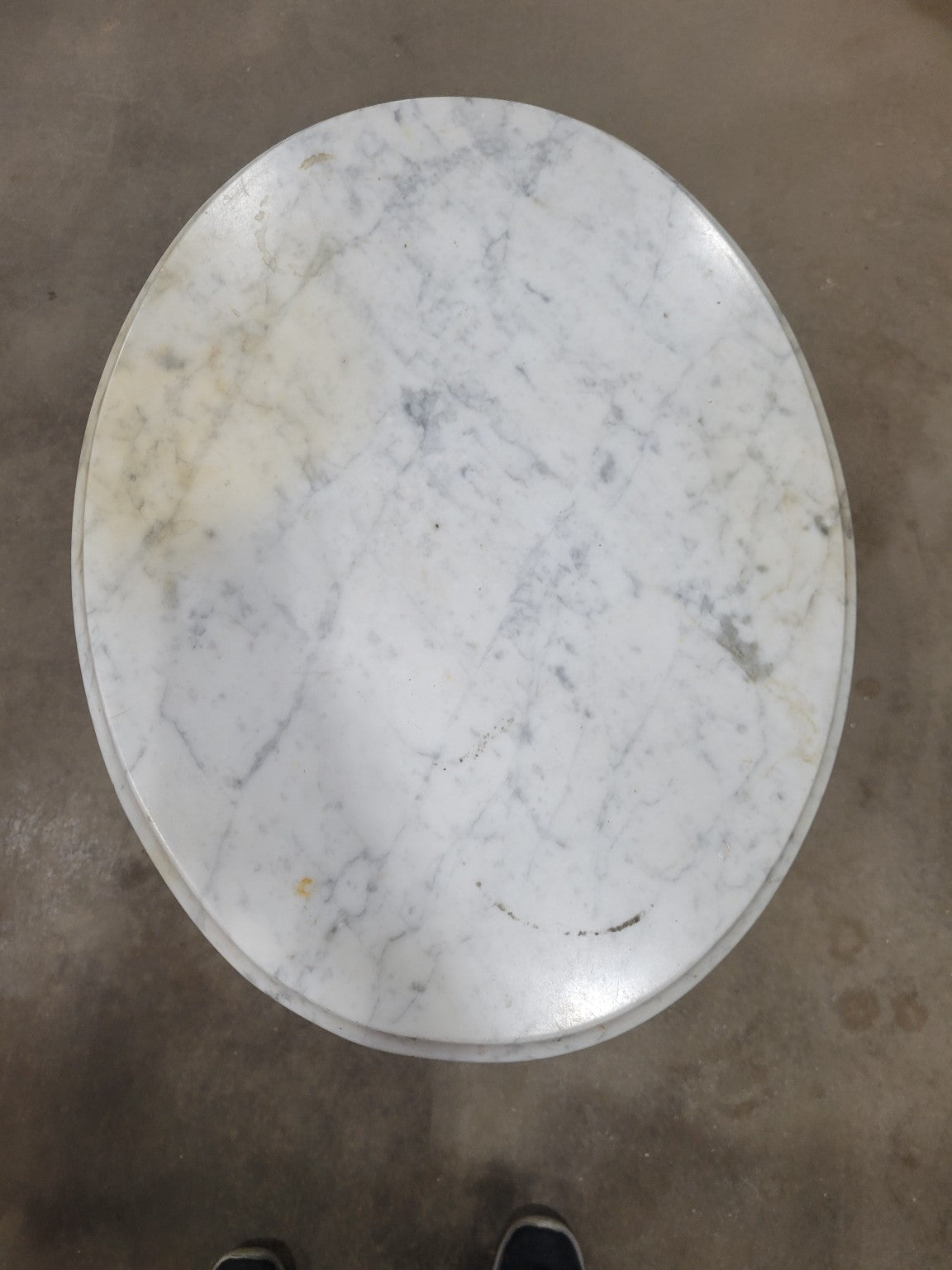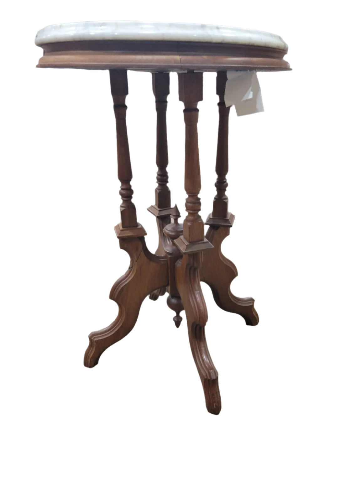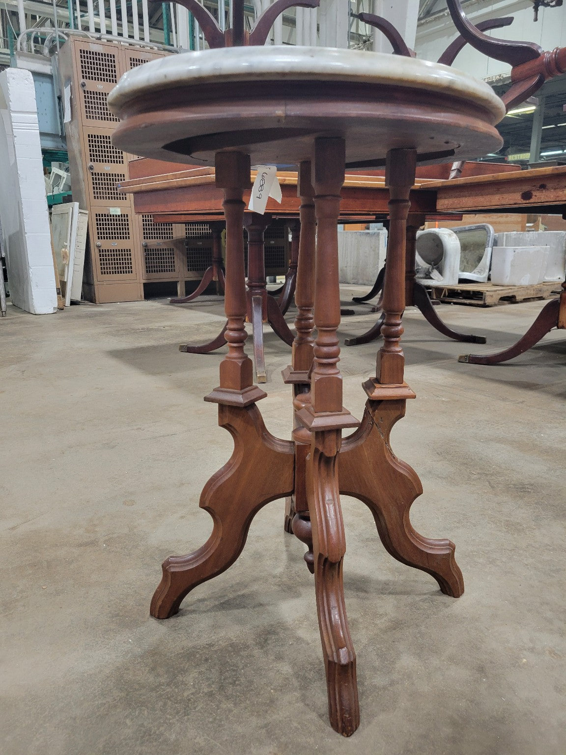 This refined marble-top parlor table is a beautiful example of Victorian Revival style, featuring a round white marble top with subtle gray veining and a deeply carved solid walnut base. The pedestal base includes four ornately turned legs with gothic arch profiles and finial detailing, all joined to a central stretcher. Measuring 19 ⅜" in diameter and 30 ¾" tall, it works well as an accent table, plant stand, or small entry pedestal.
