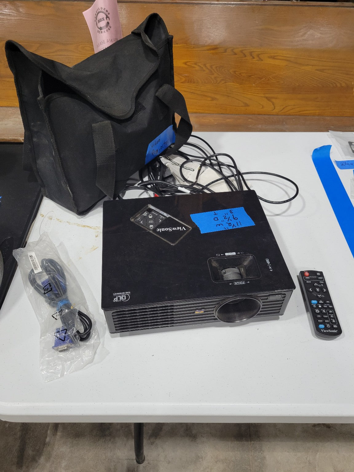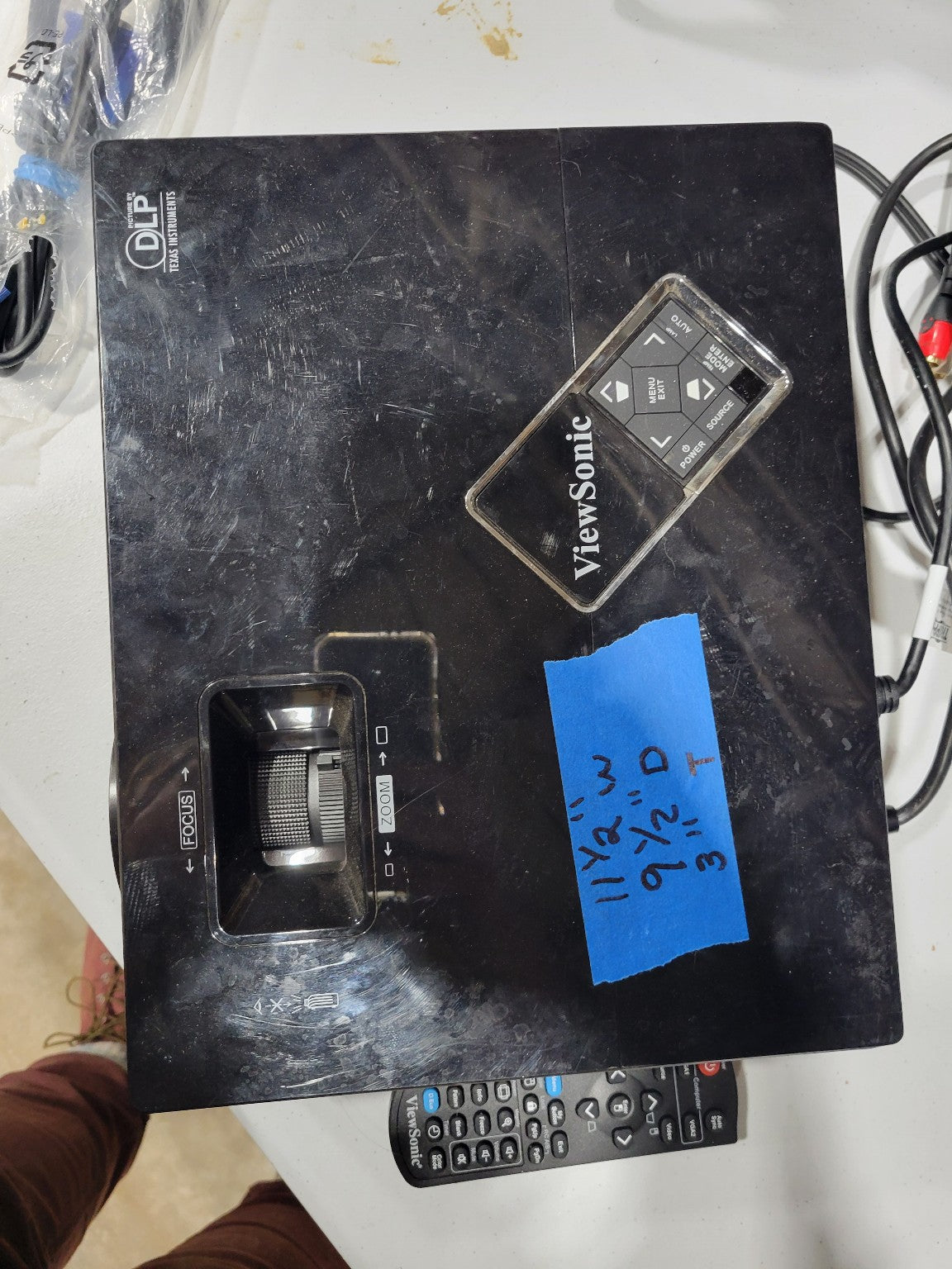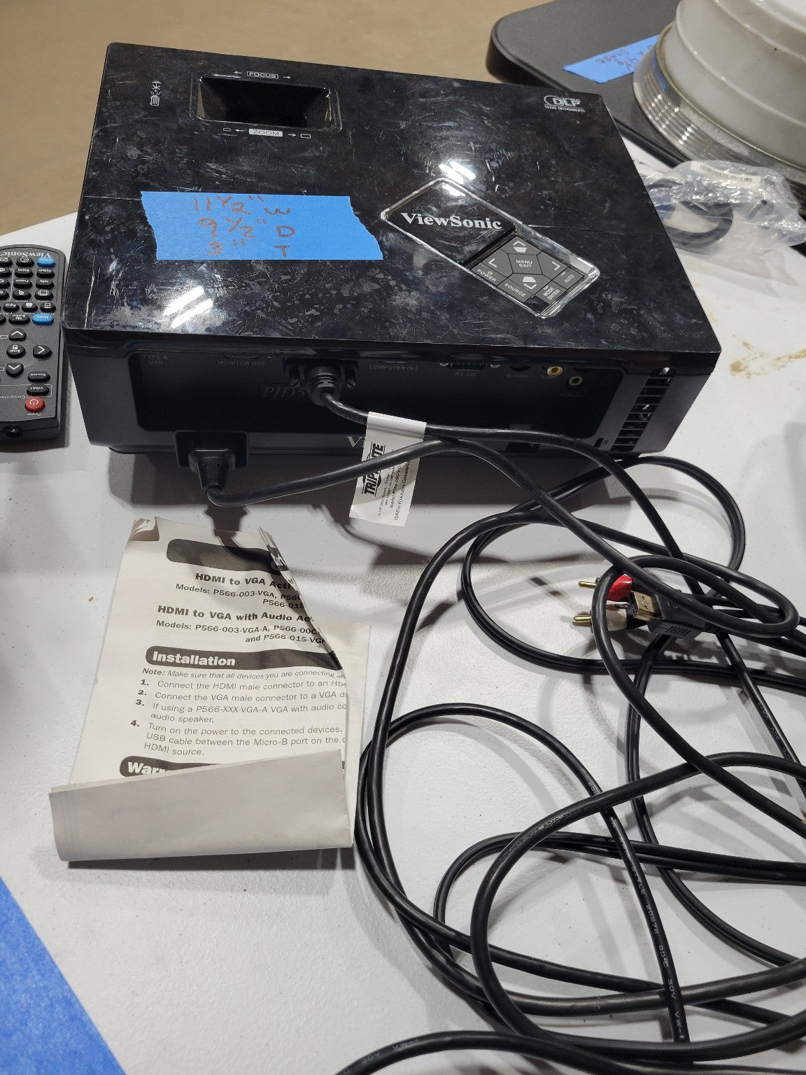 Description : ViewSonic DLP video projector bundled with a remote control, assorted connection cables, HDMI to VGA adapter, and a black carrying bag. This unit shows moderate cosmetic wear on the exterior but appears complete with accessories. Ideal for home theaters, office presentations, workshops, or DIY outdoor movie setups. Sold as-is; functionality not tested.