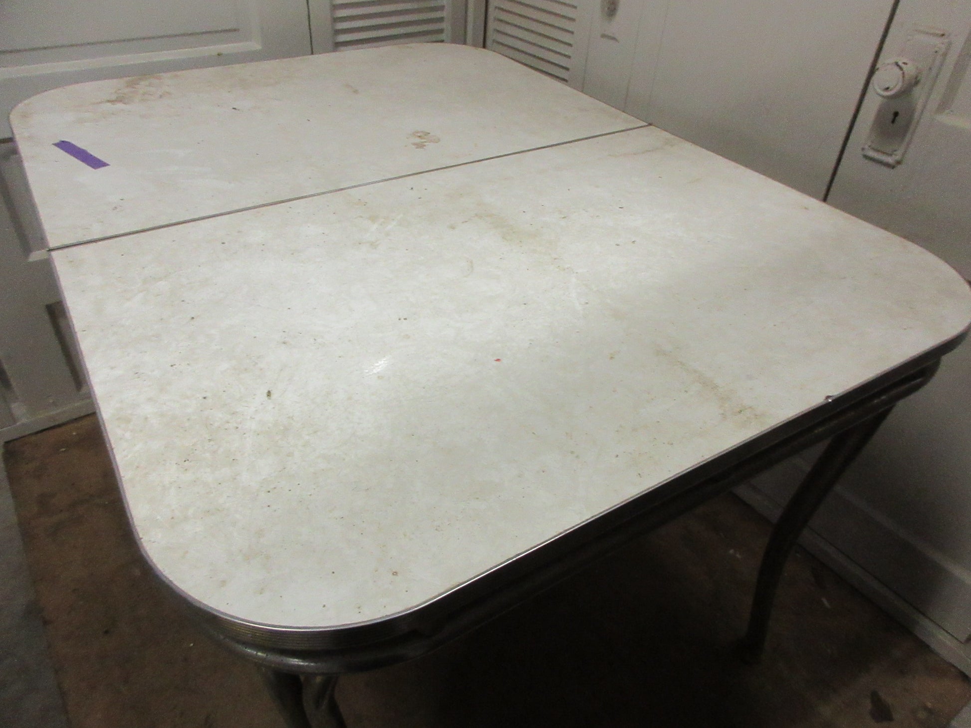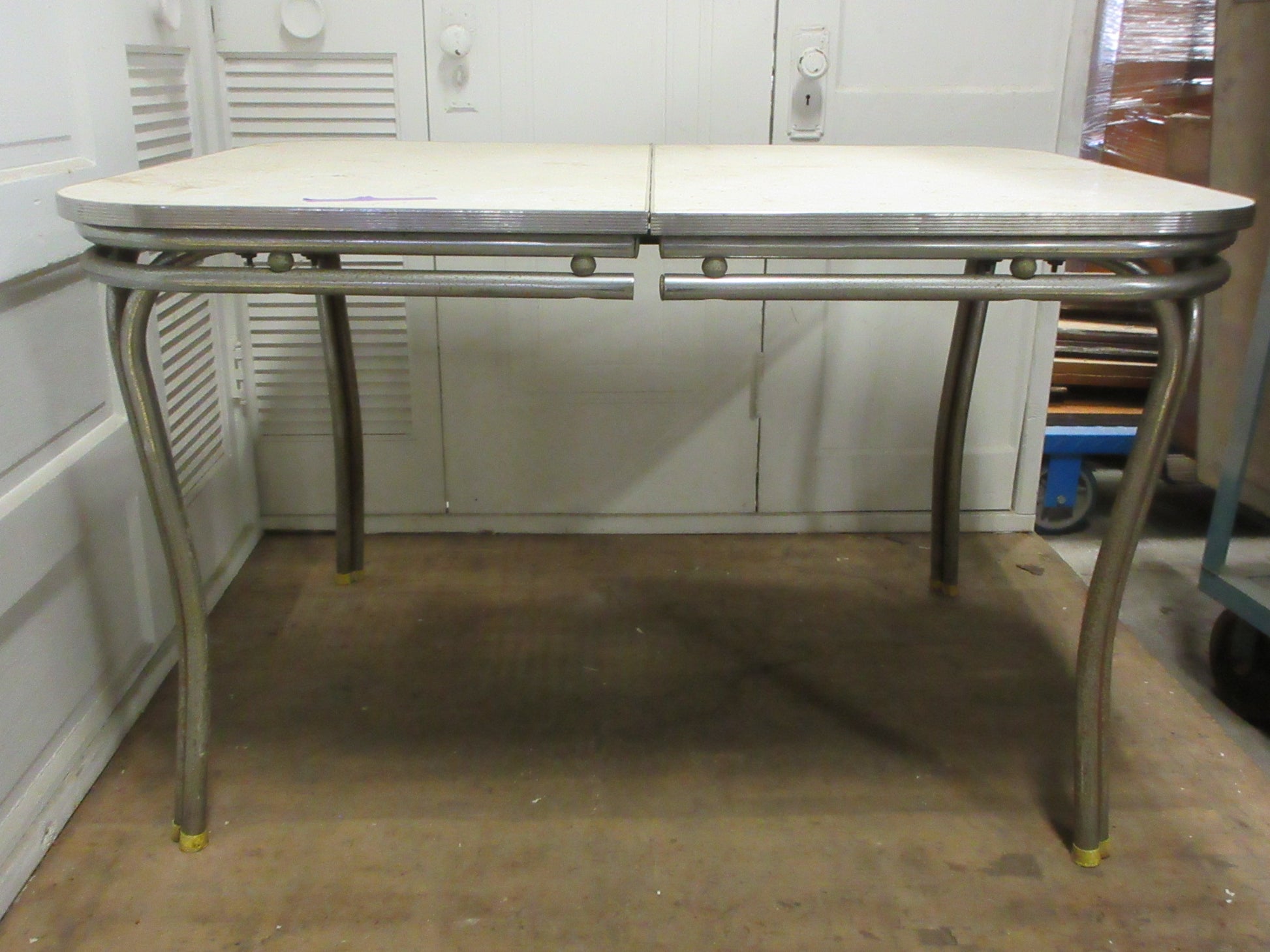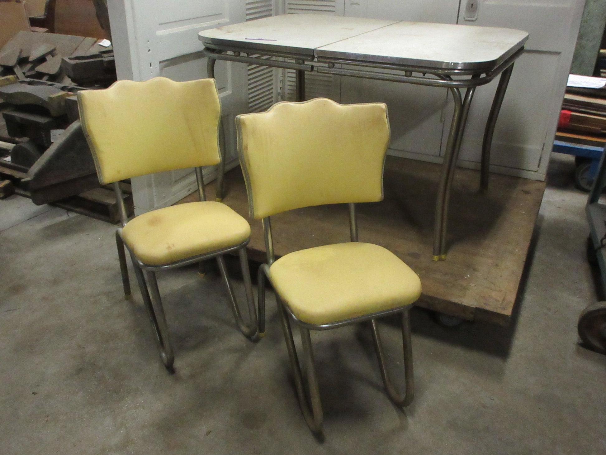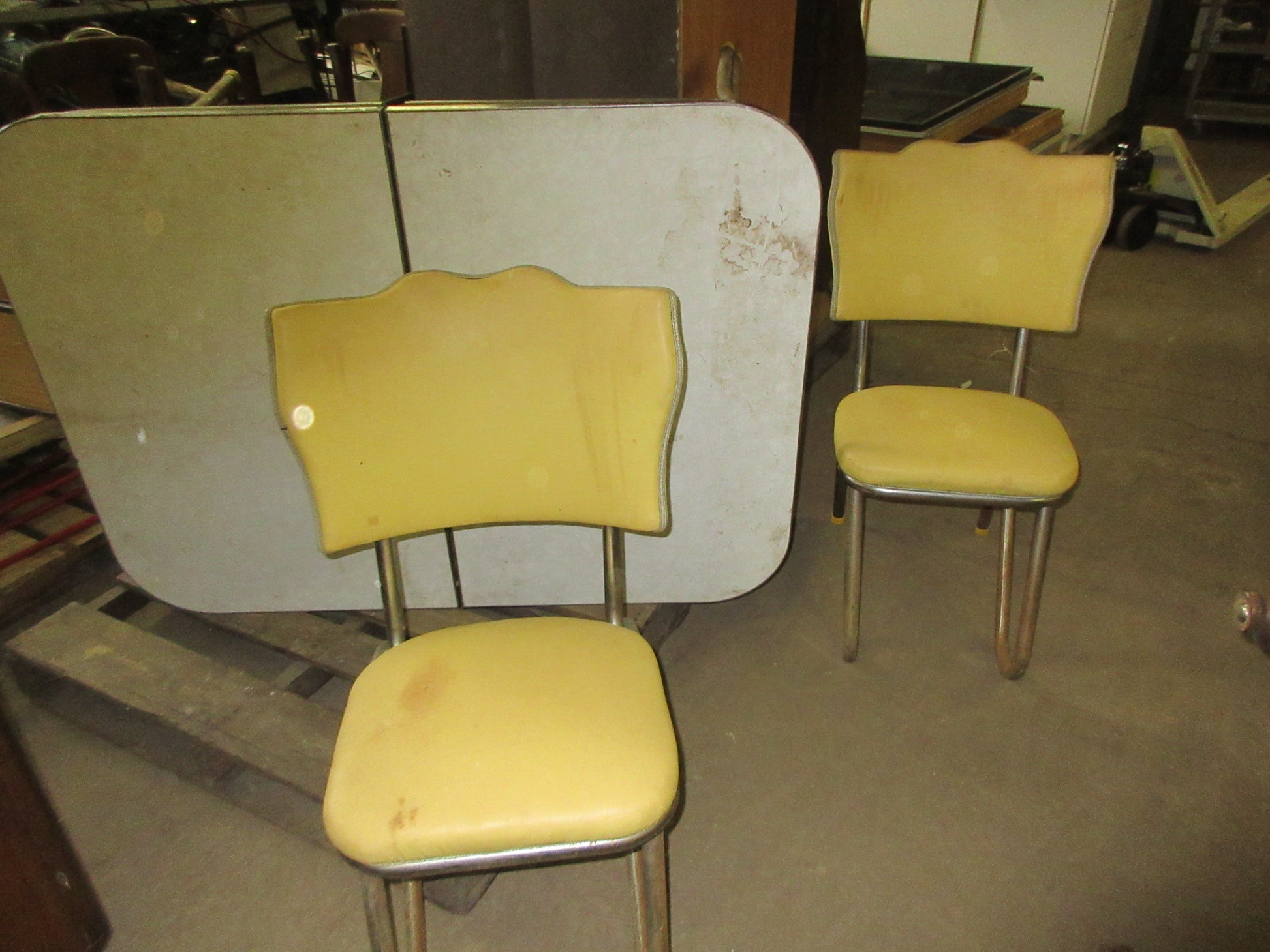 Description : Vintage kitchen table with metal legs and two vinyl upholstered dining chairs. Table measures 35 3/4"D x 48 1/4"W x 30"H Chairs measure 15 1/2"W x 34 1/4"H x 18" Seat height