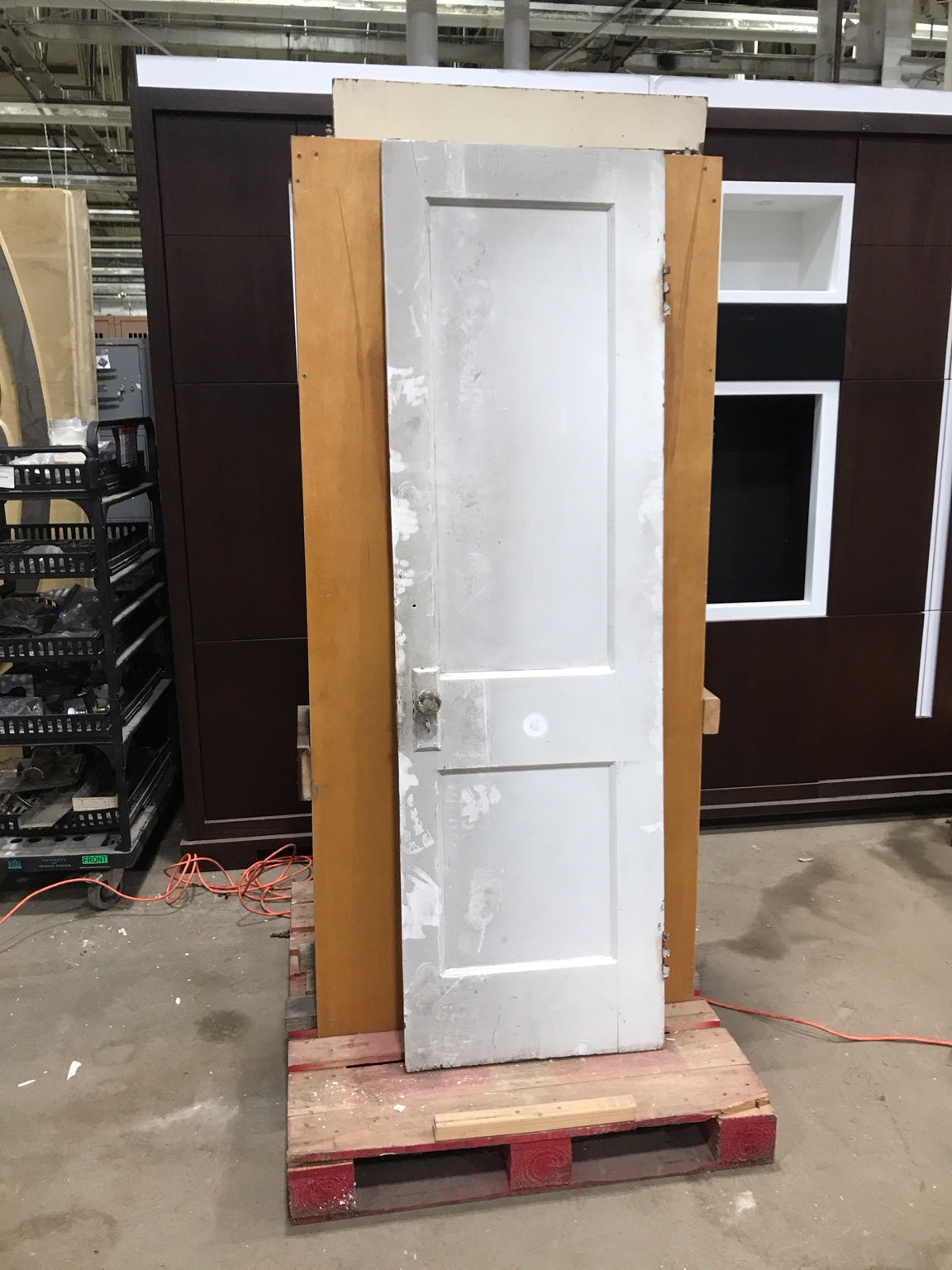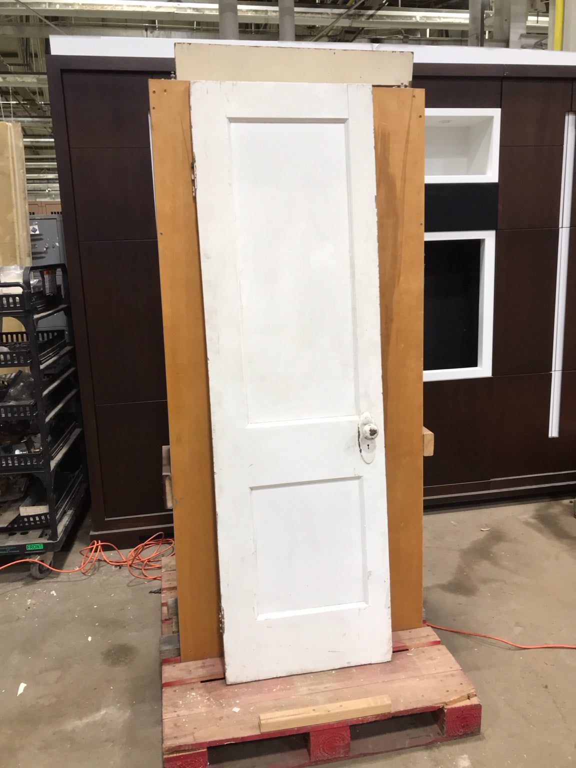 Description : Salvaged 2-panel solid wood interior door featuring heavy vintage character with worn paint, minor chipping, and original ceramic or iron knobs. The door displays classic Craftsman-era proportions with a rectangular top panel and two larger bottom panels. Ideal for restoration or rustic décor projects, this piece retains an authentic aged patina. Minor surface repair or sanding recommended for finishing, depending on intended use.