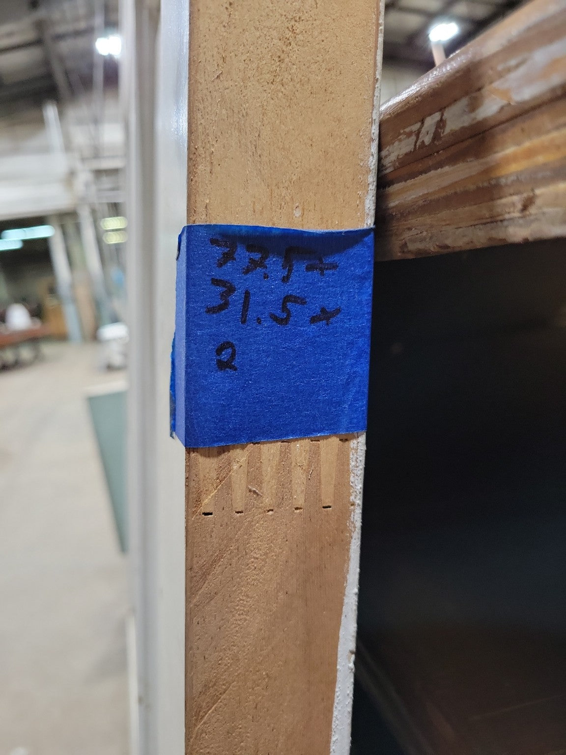 Wood core with recessed panel joinery and molded trim; butt-jointed edges with visible pin nails and adhesive fill