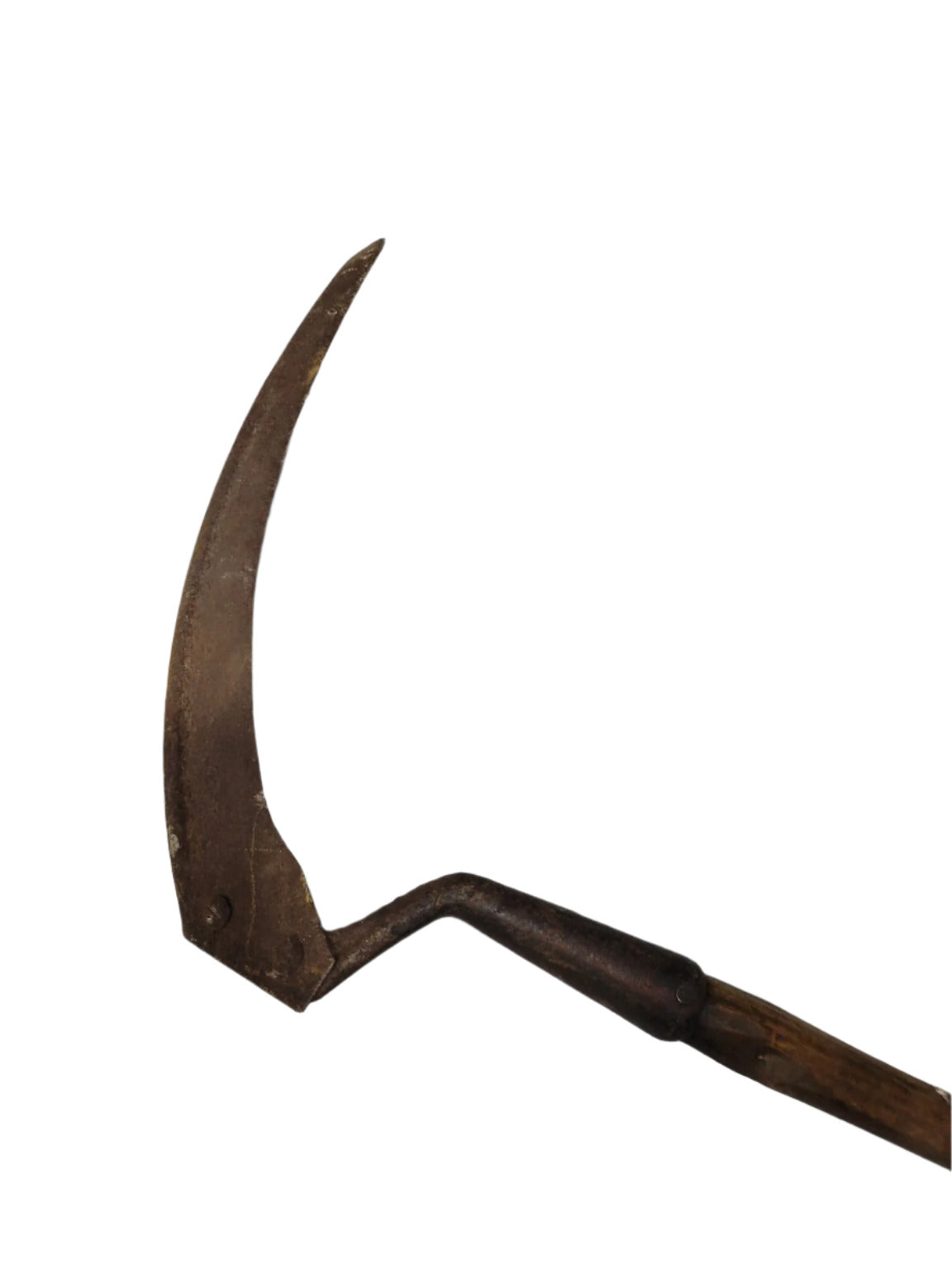 This vintage scythe features a long, gracefully curved steel blade securely attached to a hand-shaped wooden snath. The snath (handle) retains both original offset grips, designed for ergonomic mowing of tall grass or field crops. The blade shows rust and use wear typical of fieldwork, while the wood has aged beautifully with natural weathering and patina. This tool, once essential for haymaking and clearing land, now stands as a striking piece of agrarian history—suitable for display, restoration, or historical demonstration.