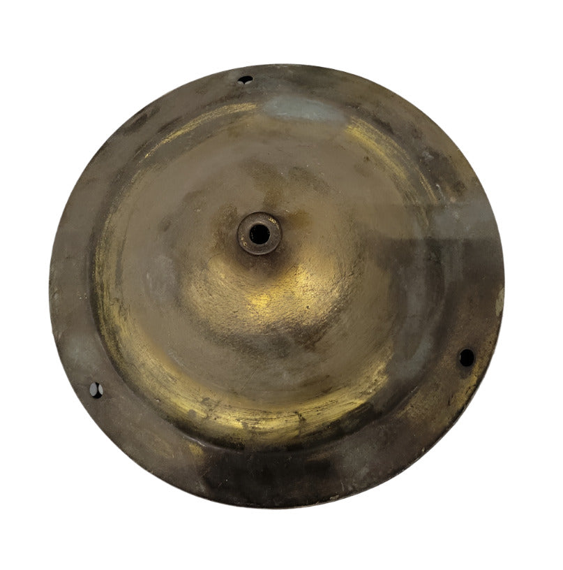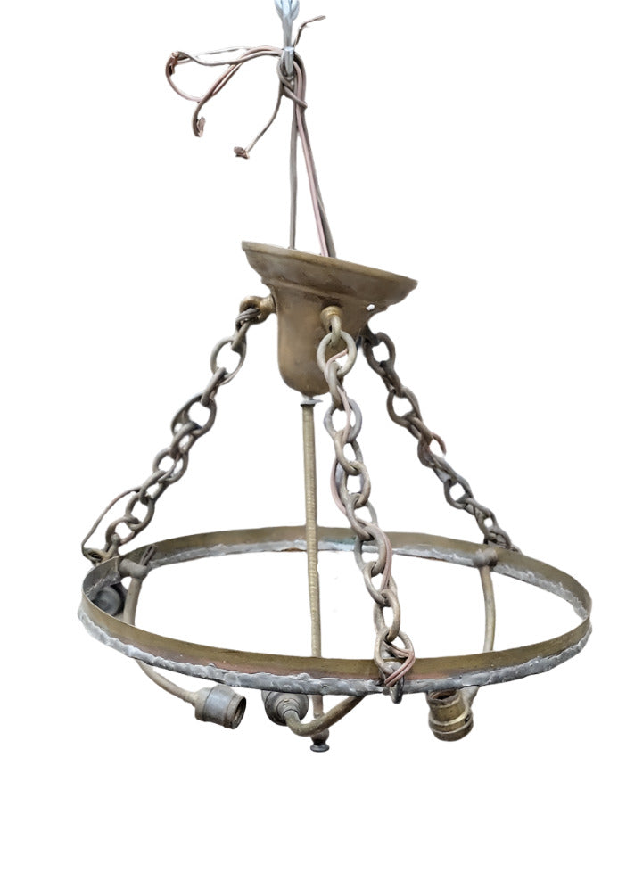 This circular hanging light frame features a raw brass construction with twisted chain suspension and three spaced bulb sockets. Once part of a fully assembled fixture, the piece currently lacks shades and bulbs, presenting an ideal opportunity for customization or restoration. The central canopy and chain design reflect mid-century industrial influences, while the aged patina gives it an appealing timeworn character. The mount measures approximately 11½" Ø with the overall diameter around 16" and height approximately 18". Some surface discoloration and dust present from storage; sold as-is for parts or repurposing.