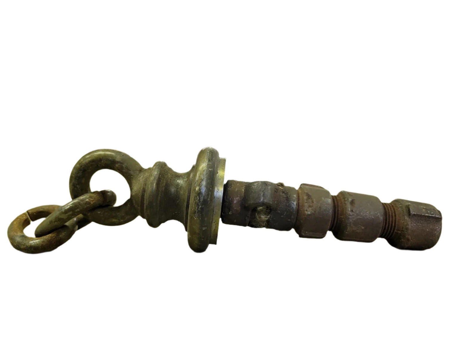 This vintage swivel hook assembly features a brass decorative collar and steel hardware, designed with a 5/8" threaded nipple fitting for attachment to hanging fixtures. Measuring 9" in total length, it includes an integrated swivel and sturdy hanging loop with chain link. Its robust construction and aged patina make it ideal for restoring antique pendant lighting, chandeliers, or other suspended fixtures.