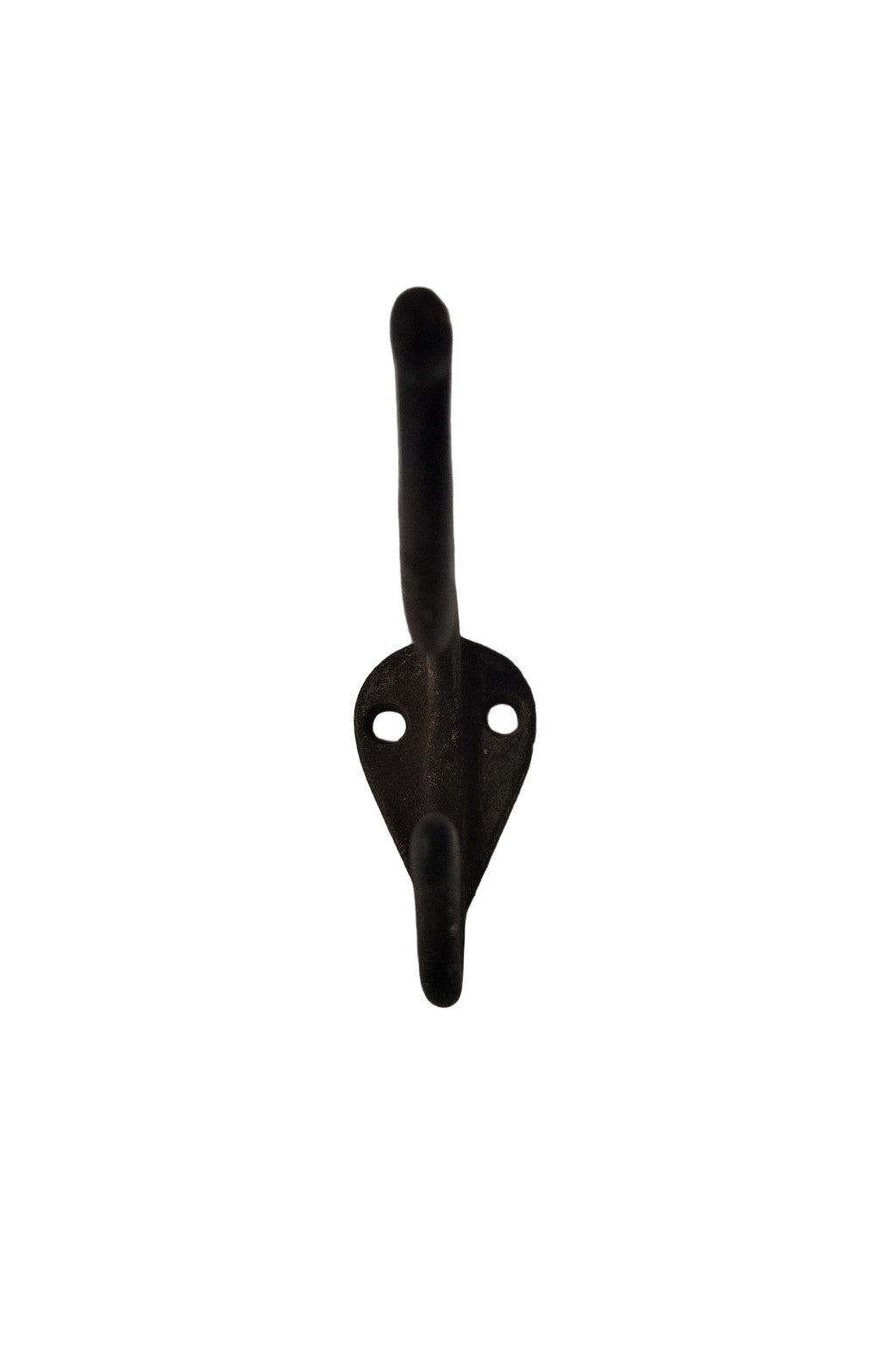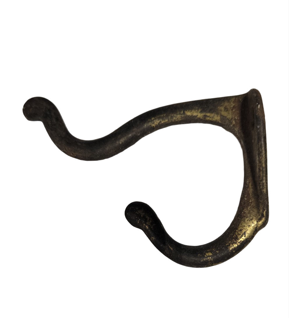 This compact vintage brass coat hook features a double-arm design and a warm patinated finish. With its curved, low-profile arms and tear-drop mounting plate, it’s ideal for hall trees, doors, closets, or small spaces where vintage detail is desired without bulk.