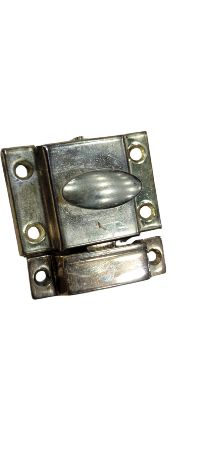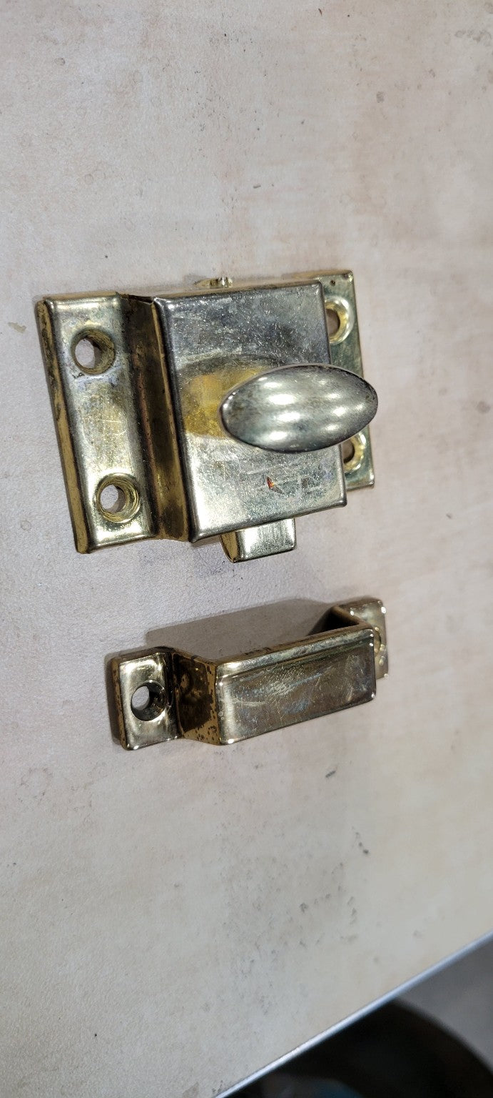 This vintage brass slide bolt latch features a polished brass finish with a simple yet elegant design. It is a surface-mounted latch, ideal for securing cabinet doors, gates, or small entryways. The oval thumb-turn mechanism ensures easy locking and unlocking. The latch comes as a complete set with the receiving catch plate.